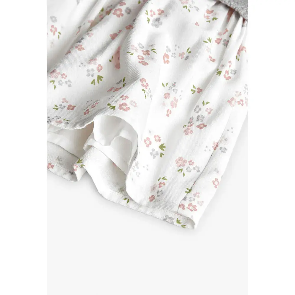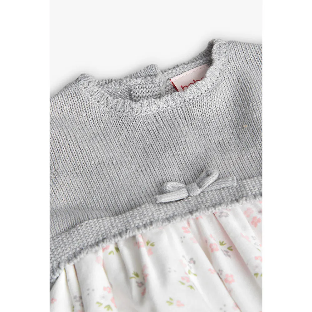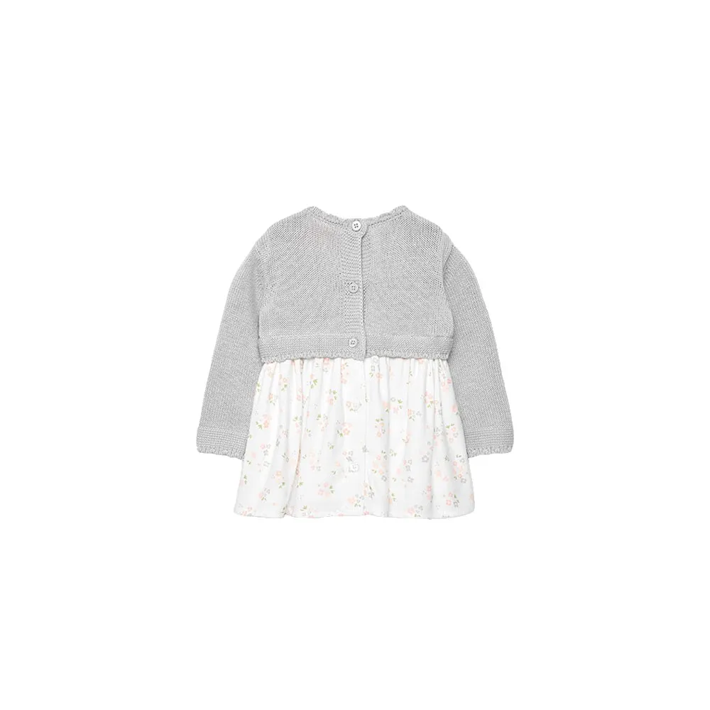 Вязаное платье для новорожденных нежно-серого цвета, украшенное нежным цветочным принтом.