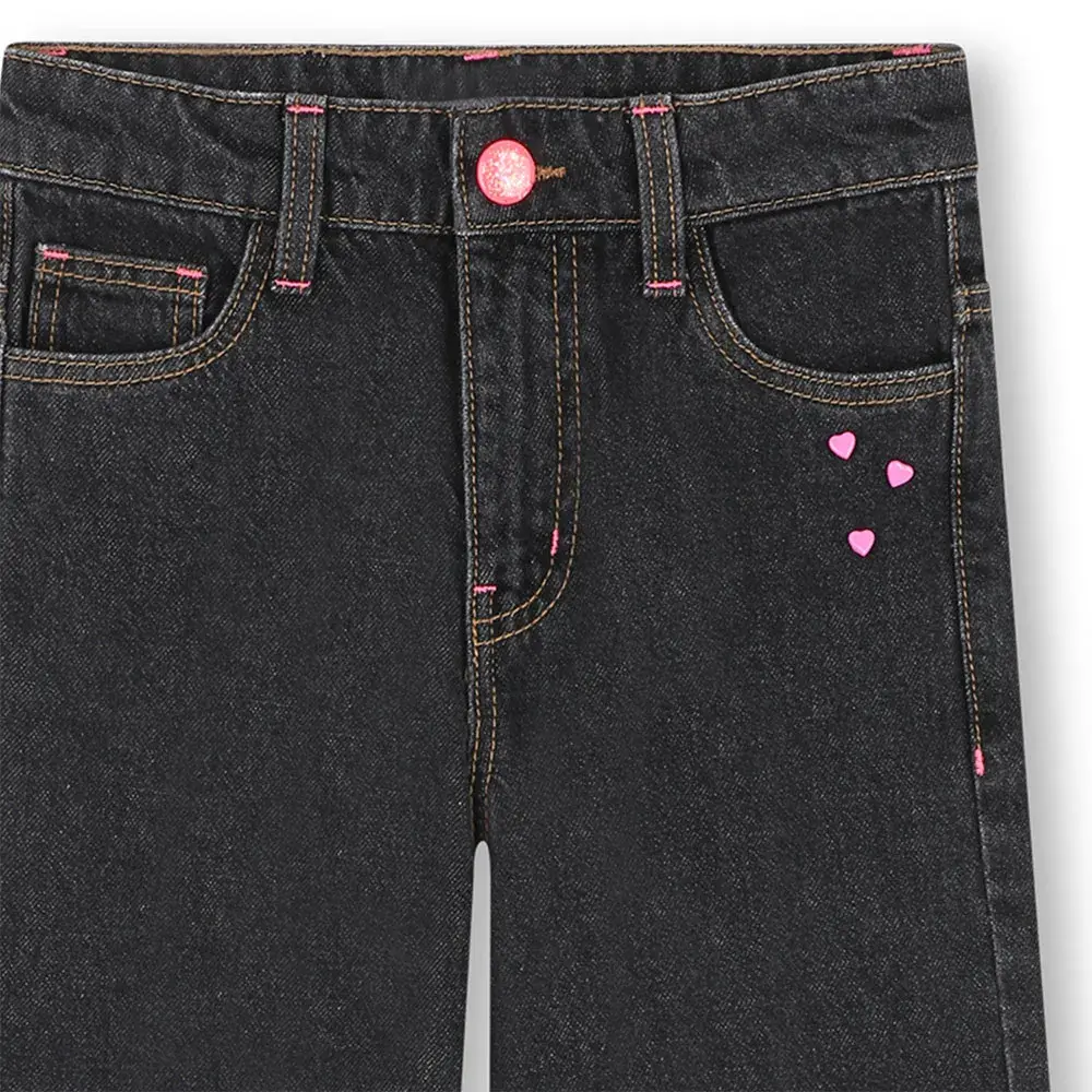 Джинсовые брюки, 5 карманов, рисунок в виде маленького сердечка, регулируемая талия, ширинка на молнии, блестящая силиконовая этикетка сзади.