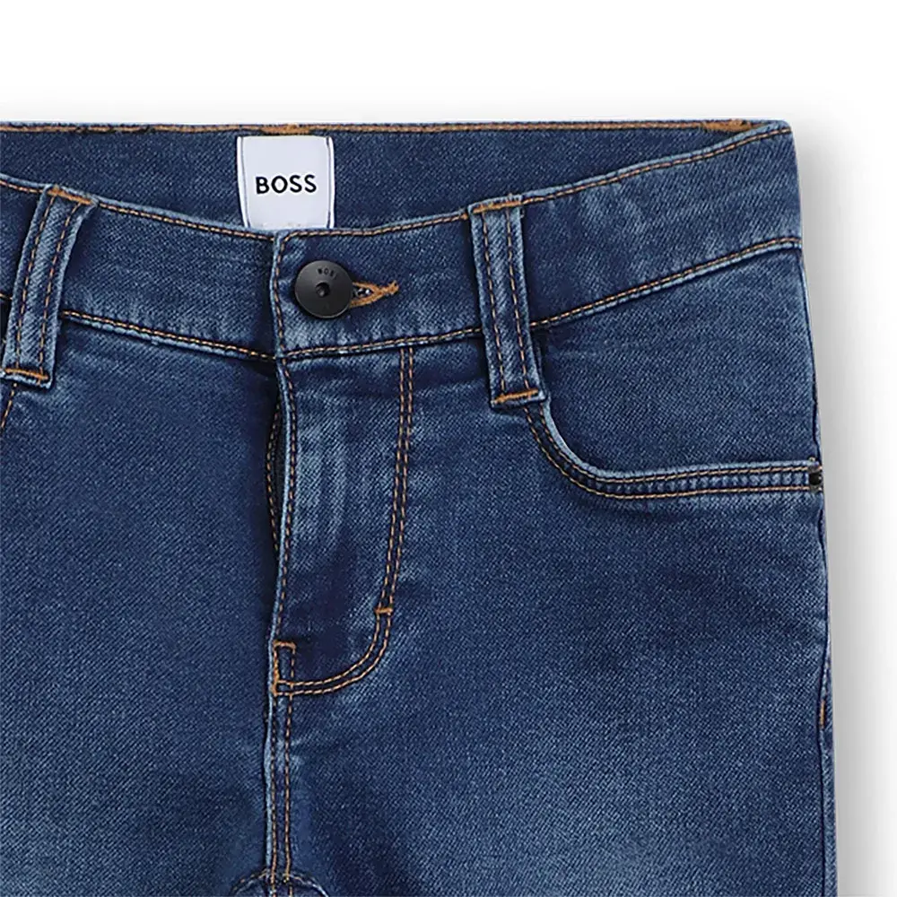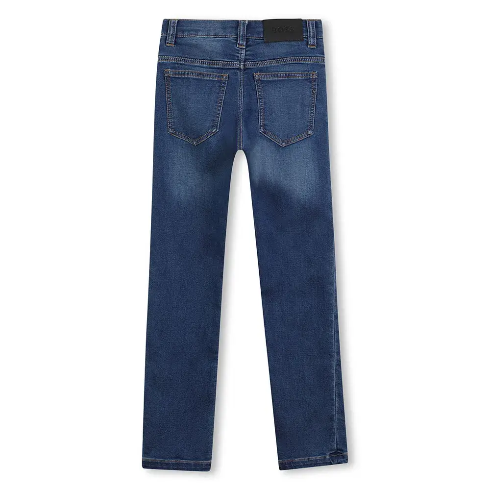 Джинсы с пятью карманами из хлопка, полиэстера, эластана, тканая этикетка с логотипом на переднем кармане для билетов, значок с логотипом из искусственной кожи сзади, необычная заклепка на заднем кармане.