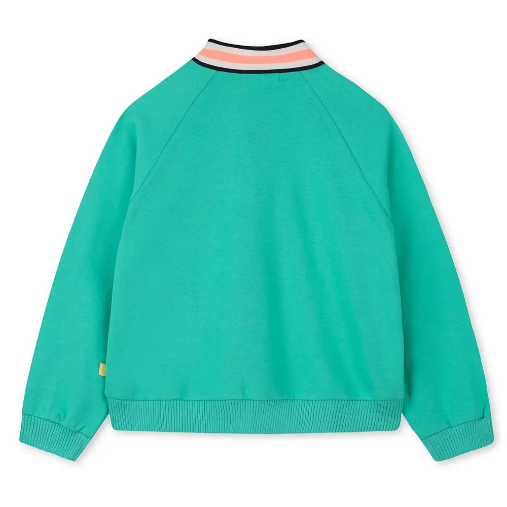 Кардиган из флиса, застежка на пуговицы с трехцветной полосой, блестящий значок и вышивка внизу, отделка в рубчик на манжетах и подоле, этикетка.