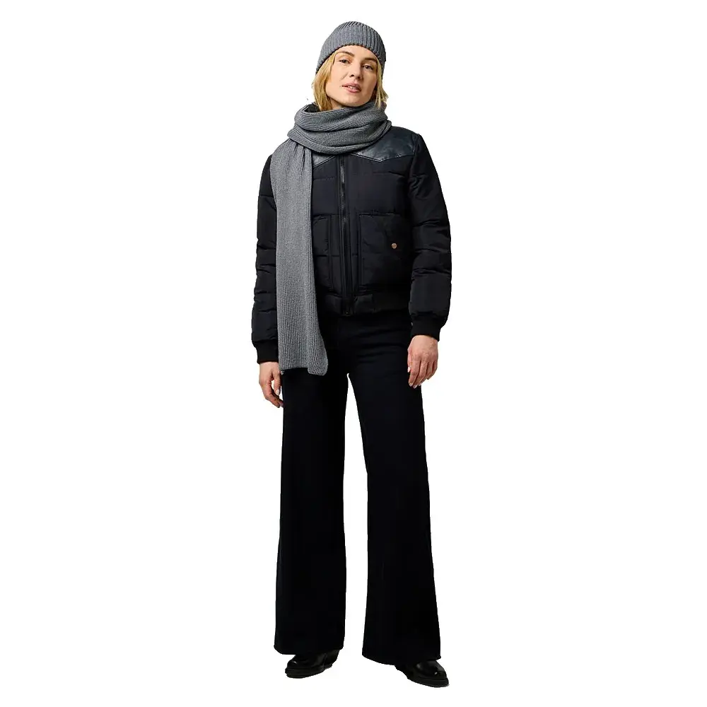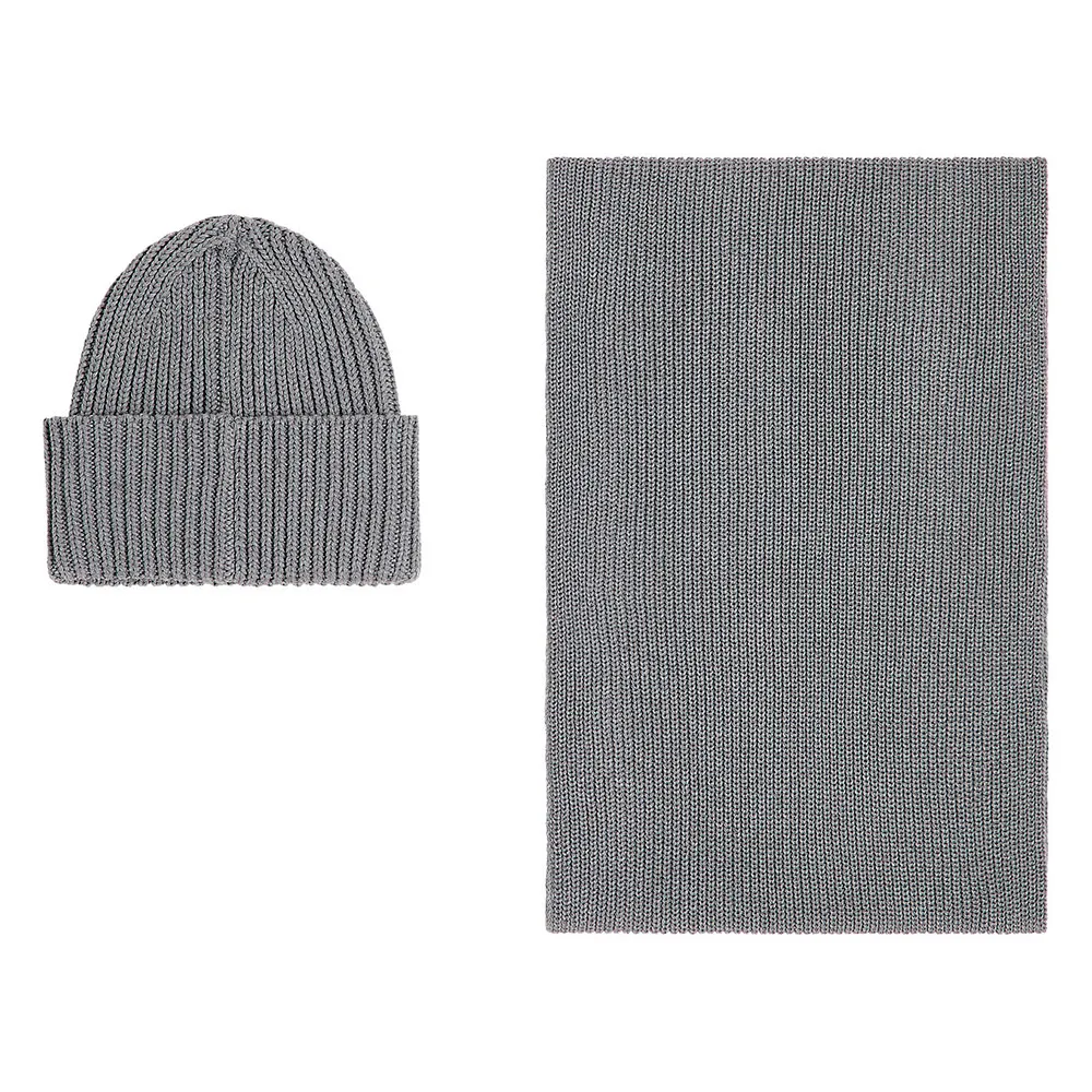 В комплект входит серая шапочка с манжетами и шарф в тон.