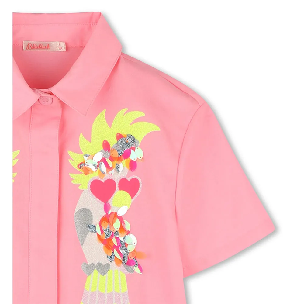 Платье-рубашка, короткие рукава, рубашечный воротник, застежка спереди на кнопках, необычная иллюстрация в пайетках спереди, этикетка.