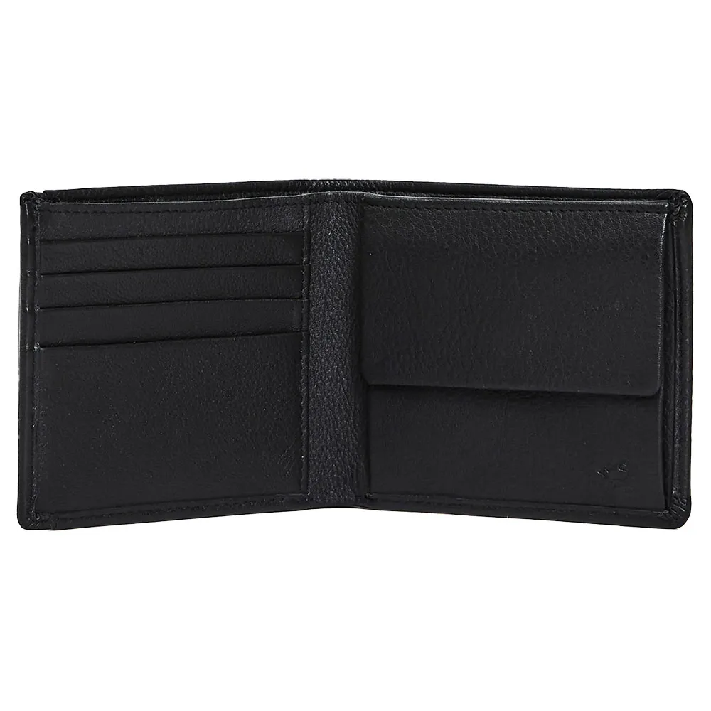 Оснащен отделениями для карт и карманом для монет, дополнен аппликацией с логотипом.