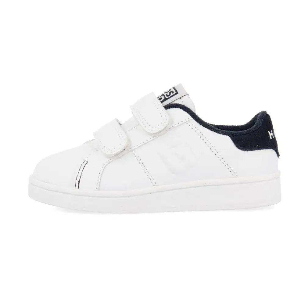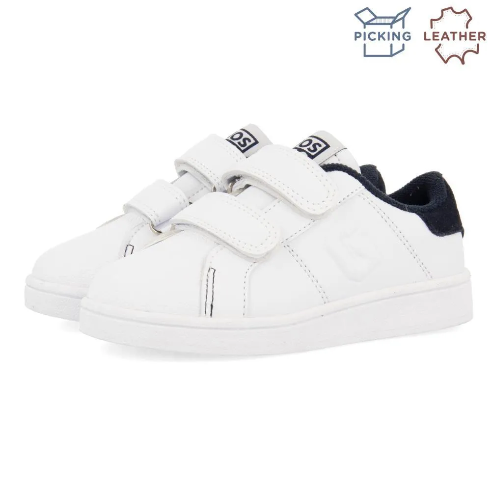 Белые студенческие спортивные туфли с регулируемой застежкой и темно-синей деталью сзади.
