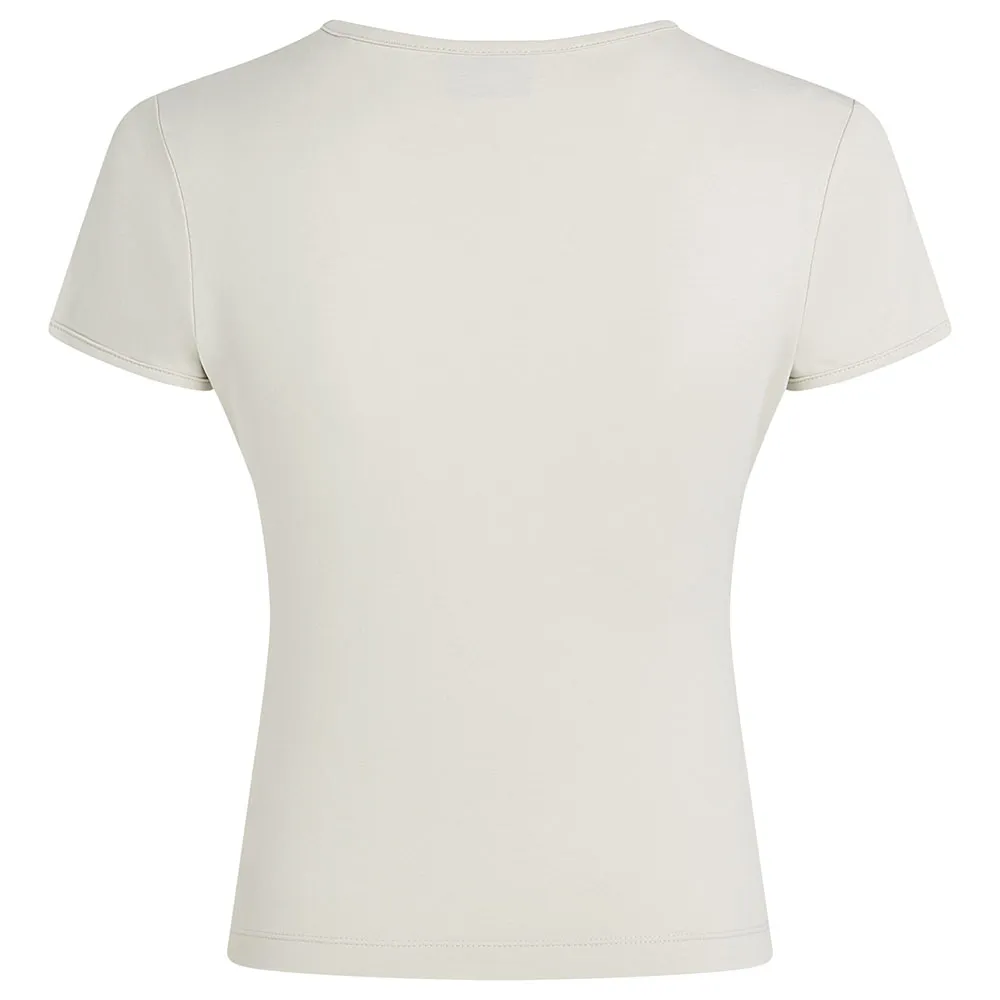 Приталенная футболка с круглым вырезом из органического хлопкового трикотажа, с укороченными рукавами и монограммой на груди. Чистая, четкая и выделяющаяся.