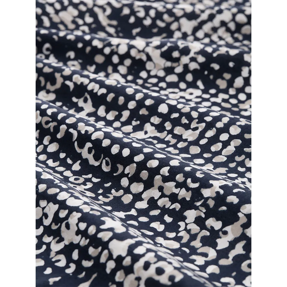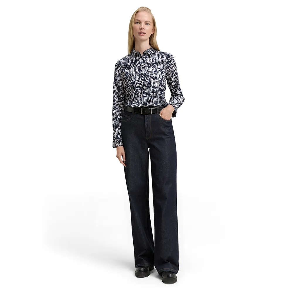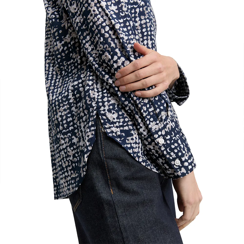 Блузка-рубашка с рисунком, разрезами по бокам и плиссированной деталью на спине.