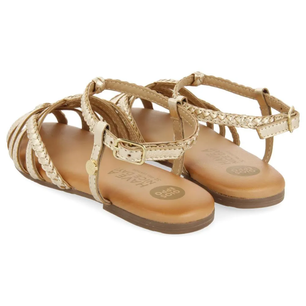 Кожаные сандалии с несколькими ремешками золотистого цвета и несколькими плетеными ремешками.