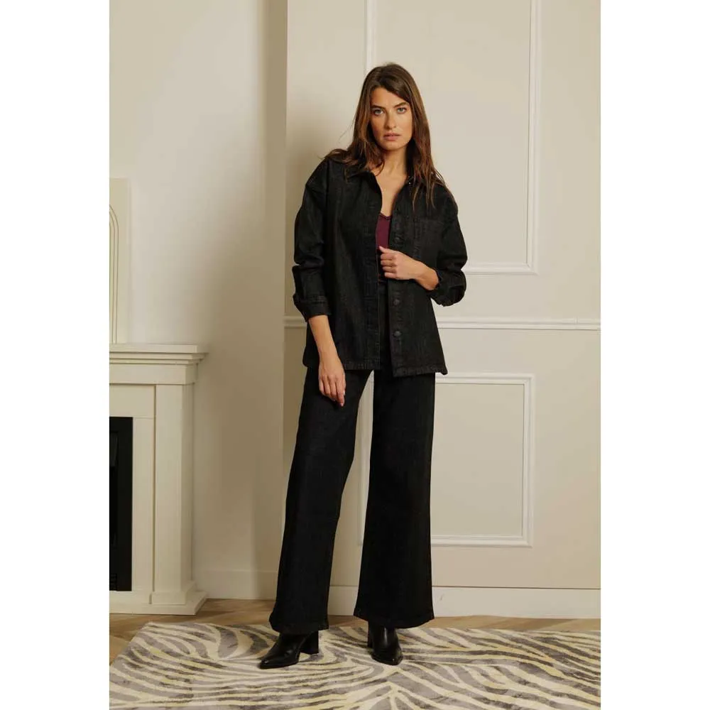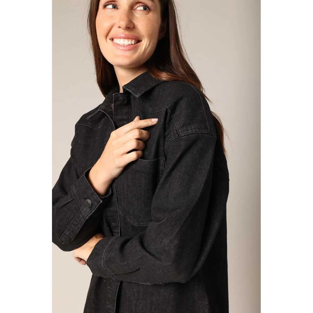 Женская верхняя рубашка ZAMORA из черного денима со слегка потертым эффектом. Эта модель имеет удобную и непринужденную посадку оверсайз, идеально подходящую для повседневного или рок-образа. Модель отличается классическим воротником рубашки, застежкой на пуговицы спереди и единственным накладным карманом на груди. Длинные рукава дополнены манжетами на пуговицах, а спинка слегка закруглена для элегантной отделки. Обязательно носить в открытом или закрытом виде, поверх футболки или свитера.