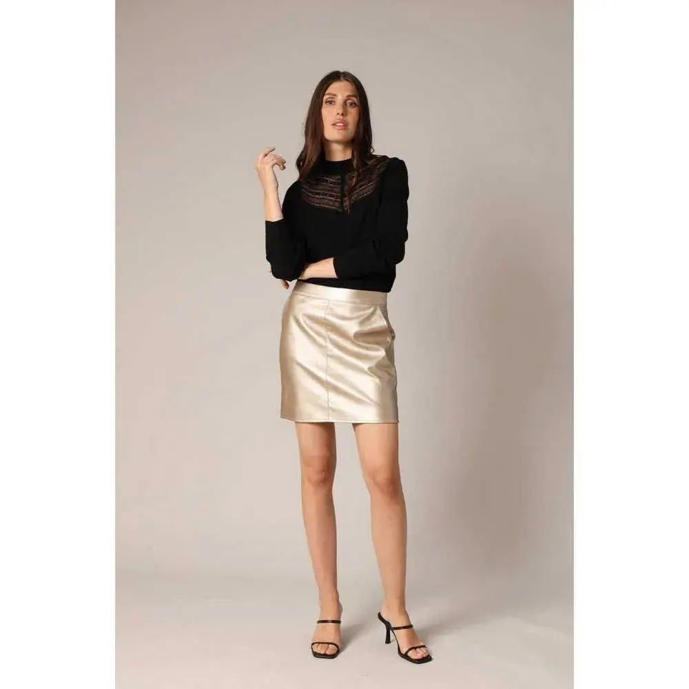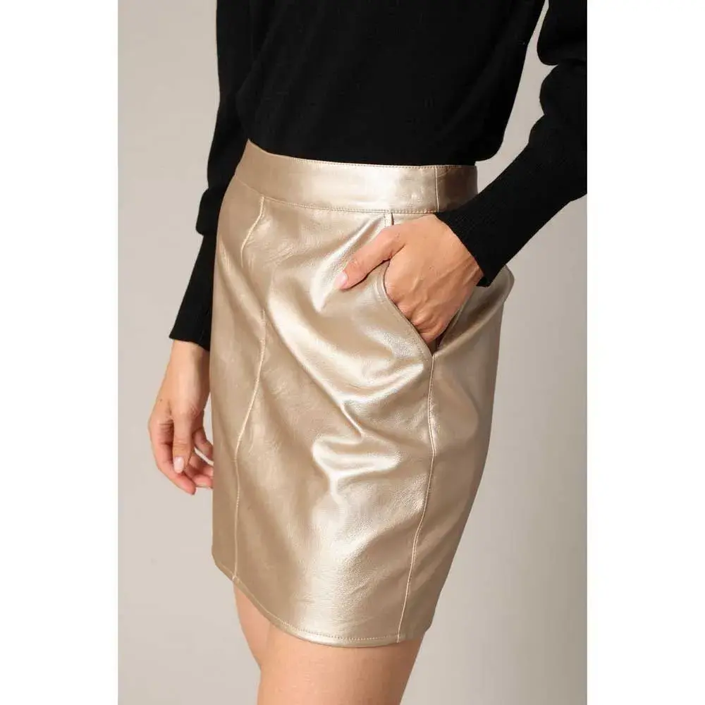 Женская юбка в шикарном и современном стиле. Модель RUBIE выполнена из блестящего и гладкого материала с эффектом металлик, с очень женственным прямым и коротким кроем. Сзади и боковые карманы застегиваются на незаметную молнию. Модная и элегантная модель, подчеркивающая ваш дневной и вечерний образ.