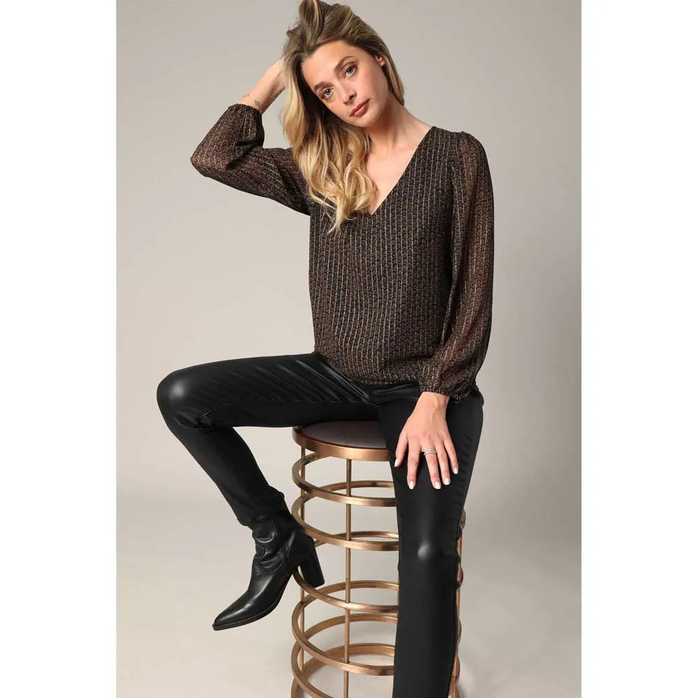 Легкая ткань и золотистый принт в этой блузке подчеркивают, что изысканность не обязательно должна быть чрезмерной. V-образный вырез изящно подчеркивает фигуру, в то время как длинные, слегка пышные рукава из вуали элегантно обнажают кожу. Узор, покрывающий всю блузку ELLINA, является наглядным напоминанием о гламуре пышных вечеров. Носите его заправленным в брюки с завышенной талией для создания образа в стиле сити-шик или с джинсами и ботинками для создания повседневного, но безупречного образа.