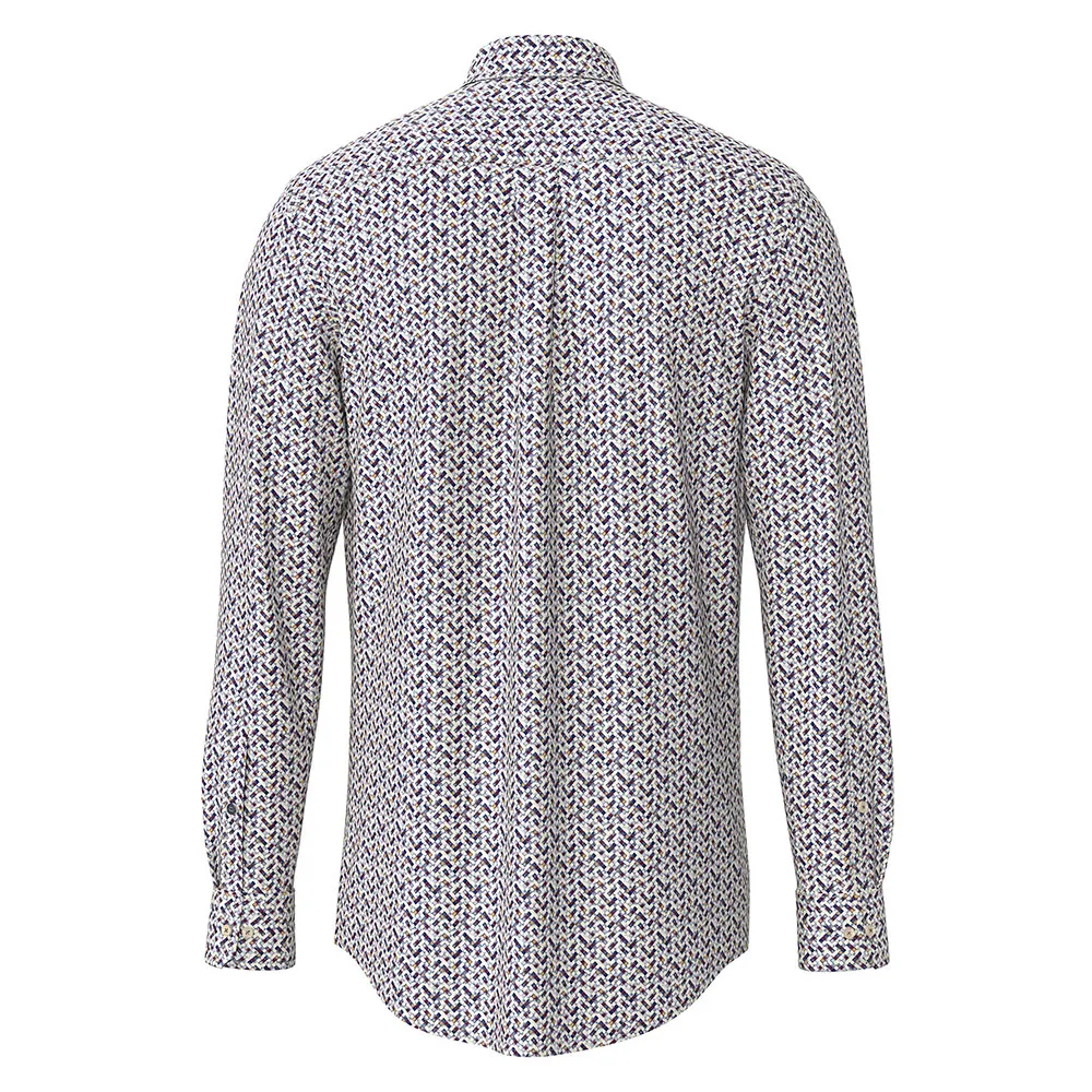 Визуально рубашка привлекает изысканным рисунком в горошек по всей поверхности. Этот тонкий микропринт придает ей индивидуальность и визуальный интерес, выделяя ее среди однотонных изделий, оставаясь при этом классической и простой в укладке. Это современный вариант традиционного узора, идеально подходящий для придания изысканности вашему ансамблю. Дизайн дополняет острый воротник рубашки на пуговицах, который сохраняет свою структуру и форму в течение всего дня, выглядя таким же элегантным в расстегнутом виде, как и под блейзером.
