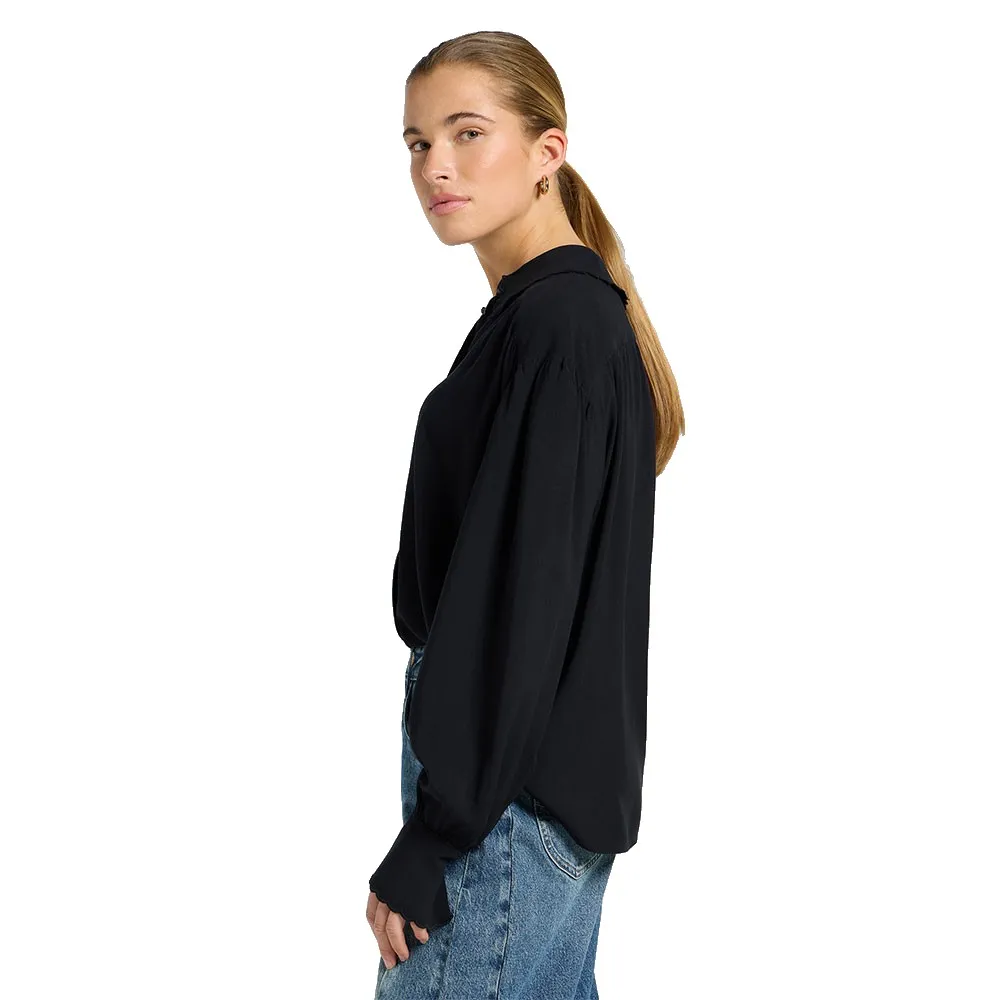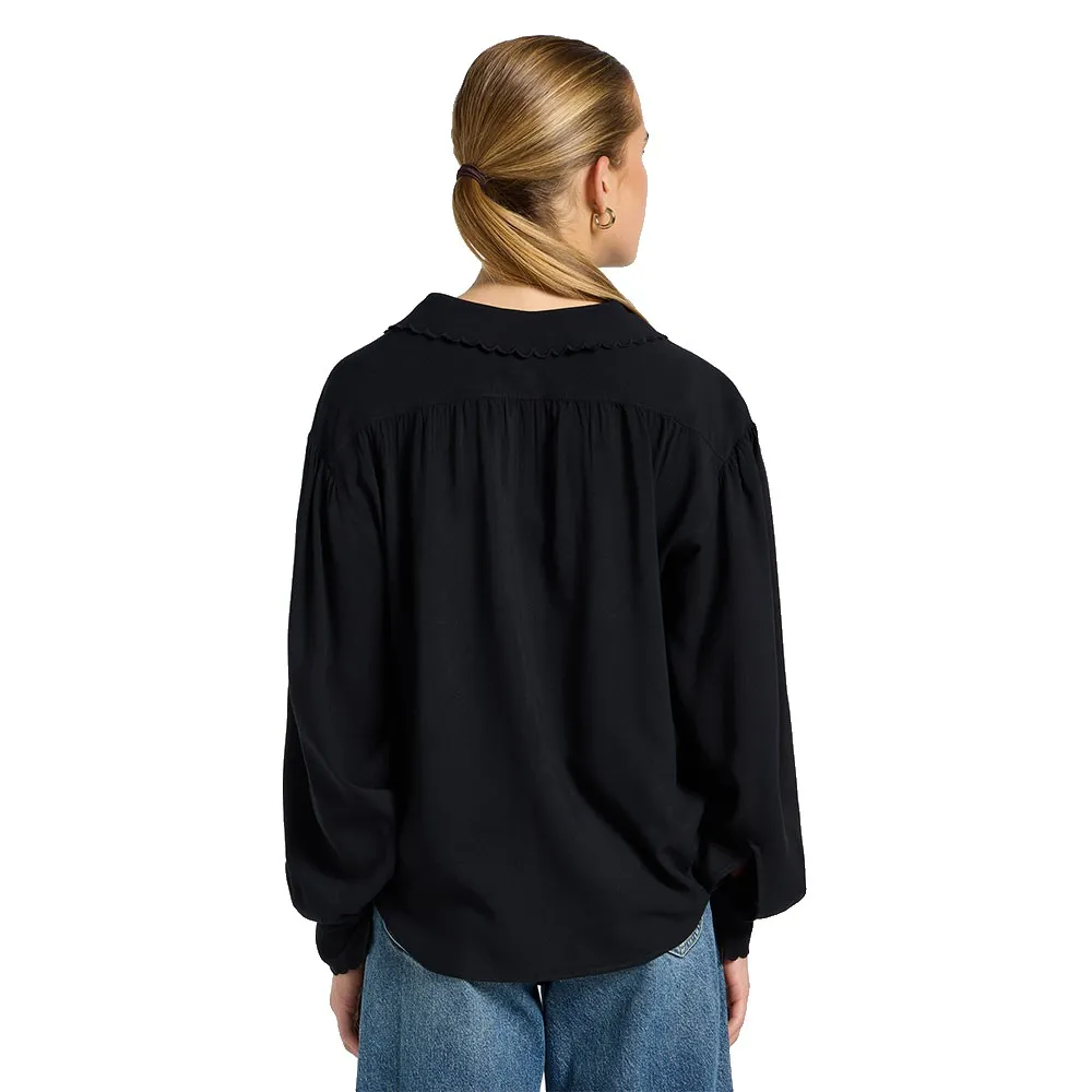 Фестончатый воротник в стиле Питера Пэна служит центральным элементом этого изделия, а рукава-баллоны и подходящие к ним манжеты с фестончатыми краями дополняют женственную тему рубашки.