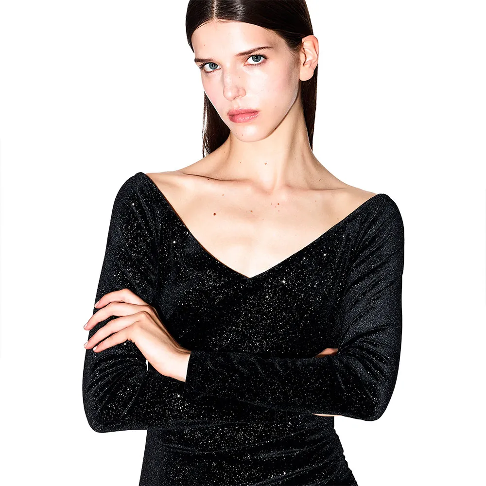 Облегающее платье с открытыми плечами, длинными рукавами и длиной миди.