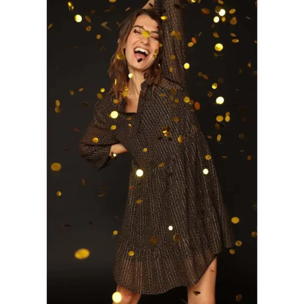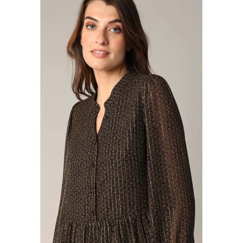 Платье JOYANE соблазняет своим плавным и женственным кроем, подчеркнутым изящным тунисским воротником и длинными, слегка пышными рукавами, затягивающимися на запястьях. Легкая ткань с изысканным графическим рисунком тонко подчеркивает прозрачность. Гофрированный низ придает ансамблю воздушность и динамичность. Это платье идеально подходит как для шикарного, так и для повседневного образа, подходит как для особых случаев, так и для дней, когда вы хотите чувствовать себя красивой без усилий.