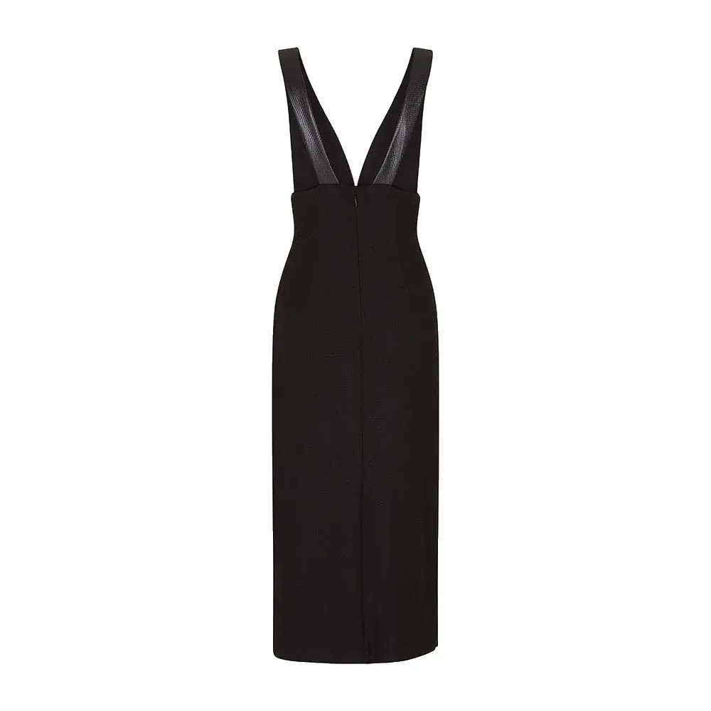 Платье миди без рукавов с завышенной талией и металлической пластиной с логотипом на левой стороне.