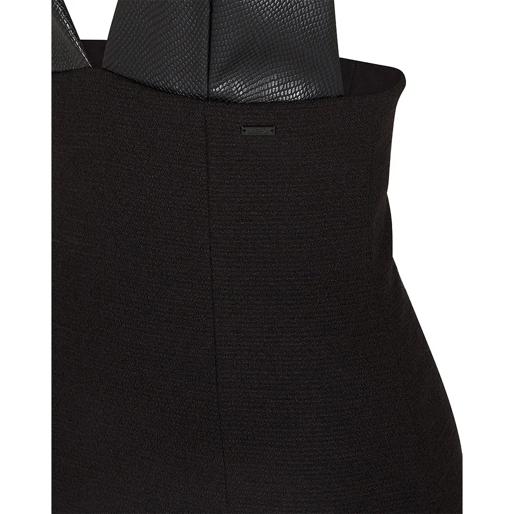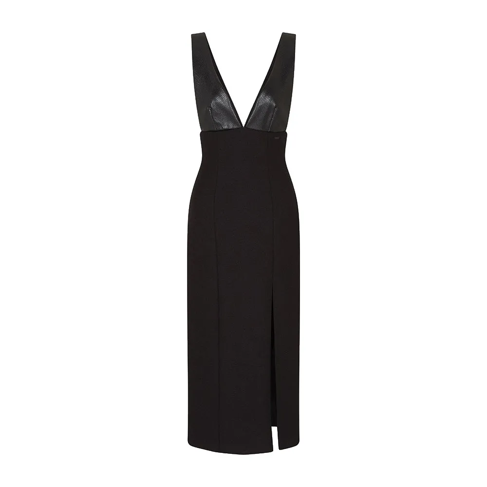 Верх боди из экокожи с принтом и низ платья с разрезом.