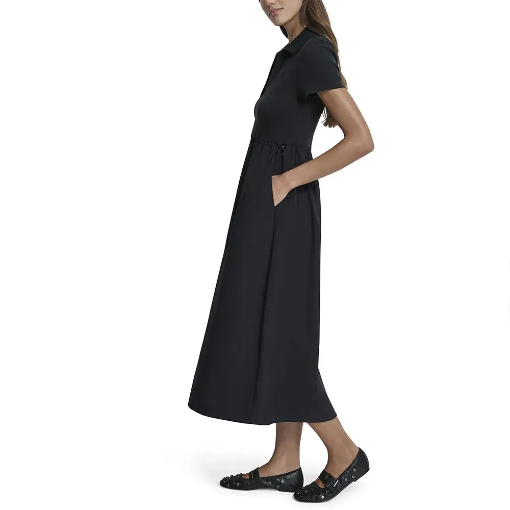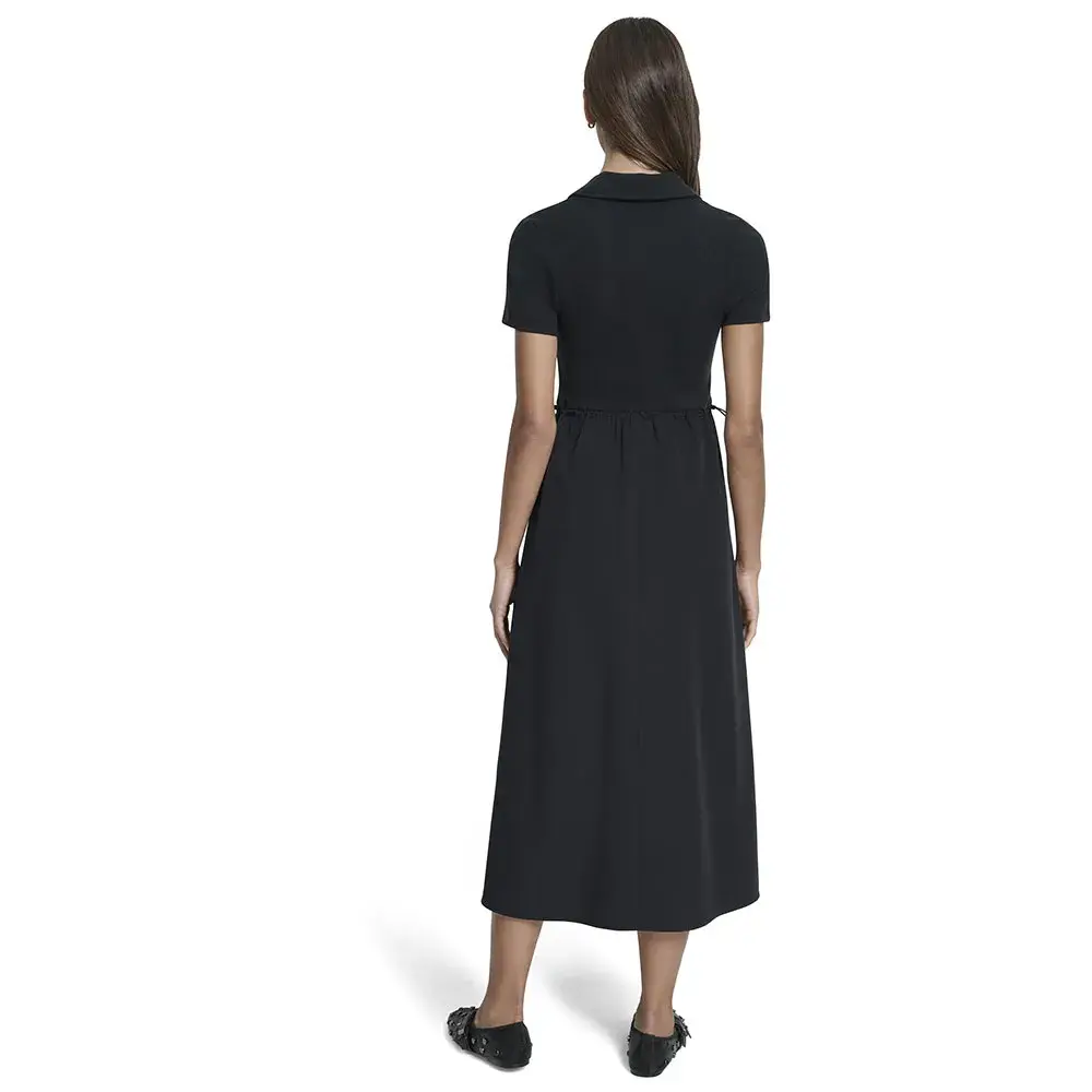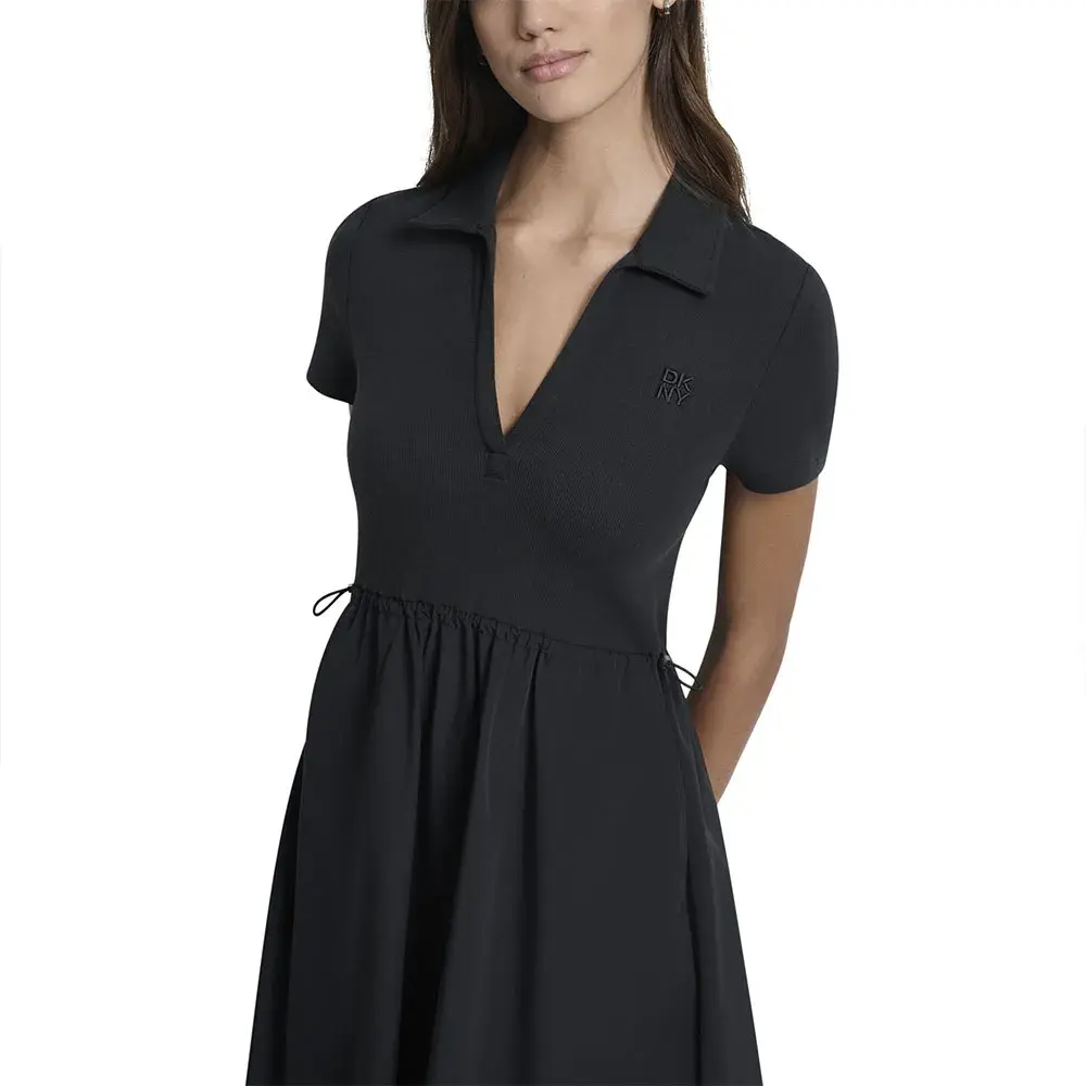 Платье миди с V-образным вырезом и короткими рукавами, дополненное юбкой из другой ткани для создания контраста.