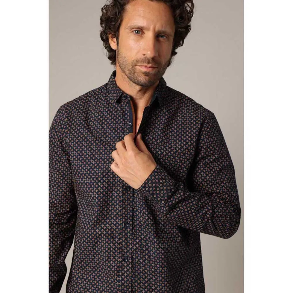 Рубашка с принтом с длинными рукавами. Эта рубашка SILAS соблазняет своим сдержанным принтом с винтажными акцентами, который придает необходимую оригинальность решительно шикарному образу. Приталенный крой подчеркивает силуэт, оставаясь при этом удобным, а классический воротник и планка с пуговицами тон в тон подчеркивают элегантность модели. Эту рубашку из 100% хлопка можно носить заправленной или нет, в зависимости от случая. Она отличается мягким и дышащим материалом.