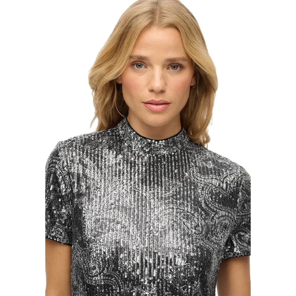 83 см Не пропустите мини-платье-футболку с пайетками, с блестящими пайетками по всему дизайну, вы обязательно будете блистать, когда появитесь на танцполе.