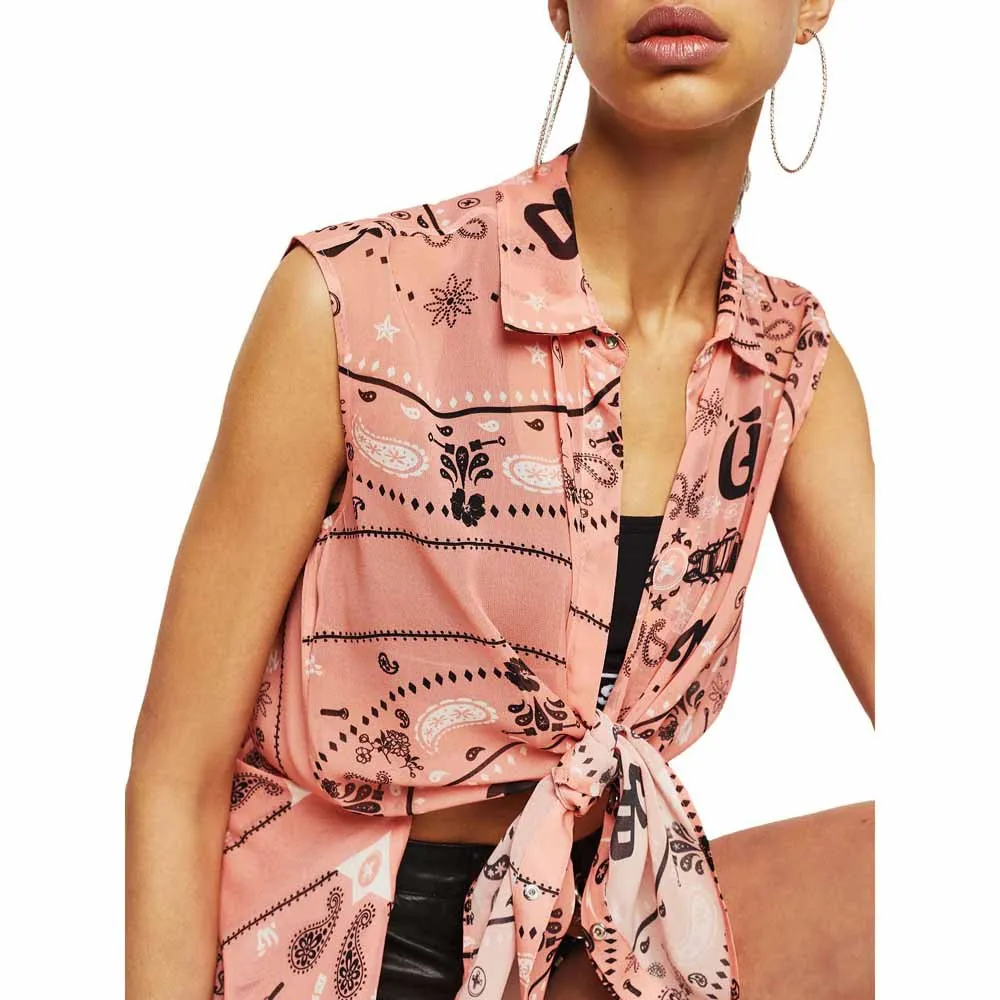 Он выполнен из комбинации ткани жоржет и мягкого джерси с рисунком банданы по всему телу.