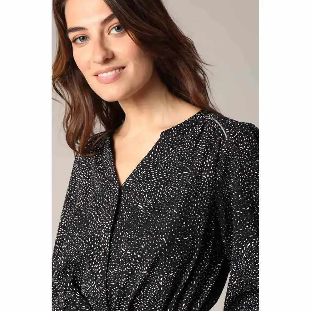 Это женственное платье отличается плавным шармом и легкой драпировкой благодаря прямому крою, подчеркнутому поясом-завязкой на талии. Сшитое из ткани с абстрактным принтом, оно отличается элегантными деталями, такими как V-образный вырез без воротника, длинные рукава-фонарики с манжетами и два практичных незаметных боковых кармана. Мягкая ткань повышает комфорт, сохраняя изысканный внешний вид. Идеально подходит для создания современного, отточенного силуэта для повседневной носки или для нарядного выхода.