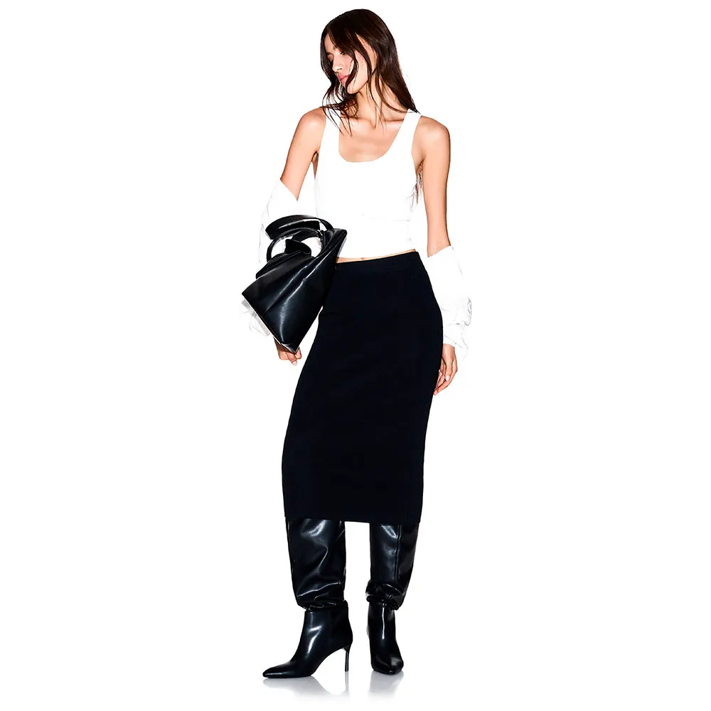 Изготовленная из высококачественной синтетической смеси, эта юбка создает ощущение роскоши и отличается исключительным качеством исполнения. Ткань красиво драпируется, создавая гладкую и полированную отделку, которая движется вместе с вами. Он обладает тонкой, удобной эластичностью, которая позволяет вам свободно двигаться в течение всего дня, гарантируя, что стиль никогда не приходит в ущерб комфорту. Этот современный материал также эластичен, сохраняет свою безупречную форму и не мнется, что делает его идеальным выбором для путешествий или долгих будней, когда вам нужен наряд для выступления. Длина миди обеспечивает идеальный баланс между классикой и актуальностью, предлагая изысканное покрытие, которое одновременно является трендовым и неподвластным времени шиком. Сдержанный, но культовый вышитый логотип с левой стороны служит тонким намеком на дизайнерское наследие юбки, добавляя нотку эксклюзивного стиля A / X.
