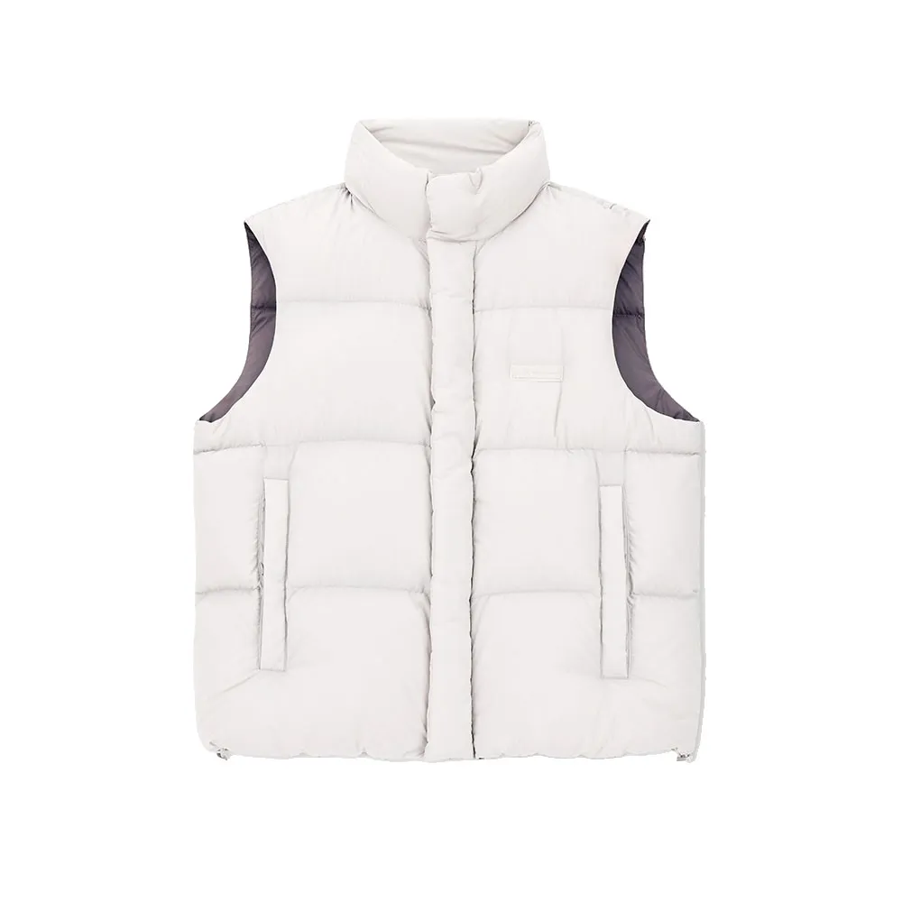 Жилет из натурального пуха на молнии, имитация горловины, прорезные карманы и нашивка с логотипом в крупный рубчик на груди.