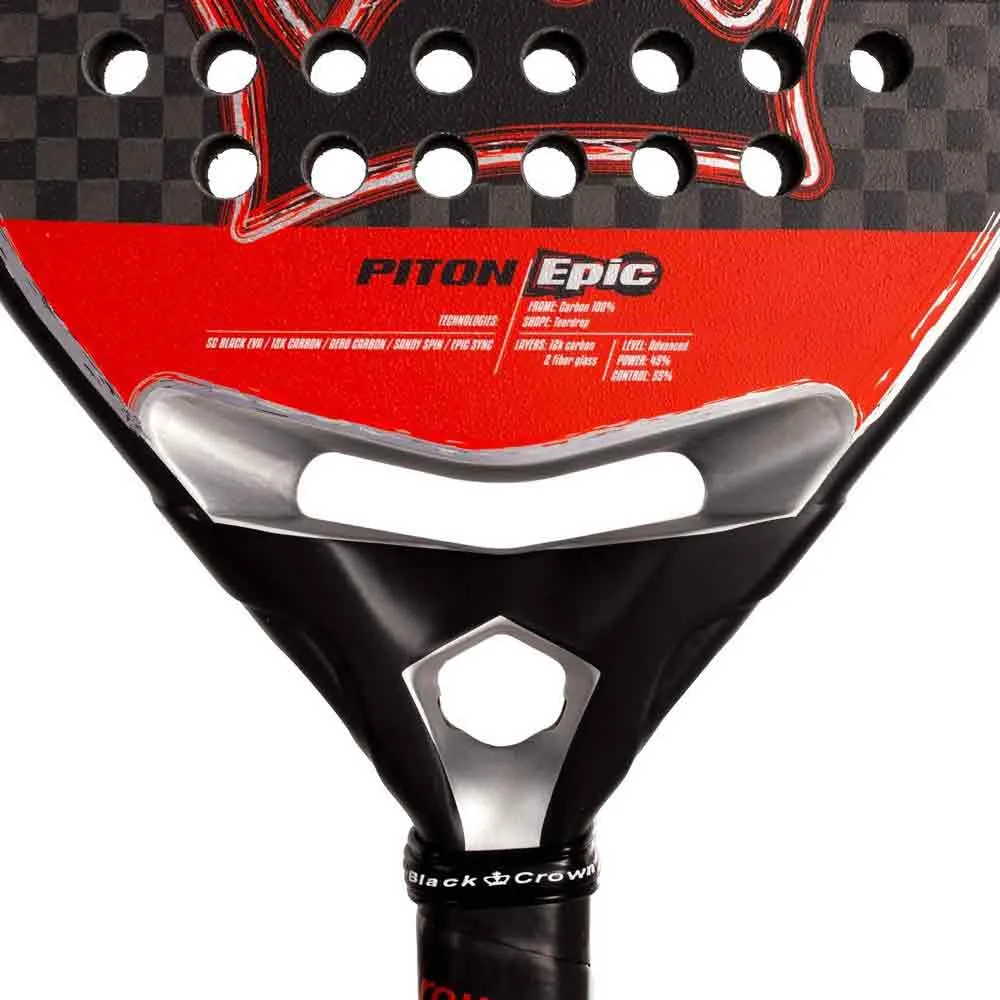 Ракетка для паделя Piton Epic. Вес: 355-370 г. Марка: 38 мм. Постоянный профиль. Трубчатая рама из 80% карбона. Форма: каплевидная. Внутренний сердечник: карбон 12k. Резиновая прослойка: SC Black Eva. Мощность: 45%. Контроль: 55%.