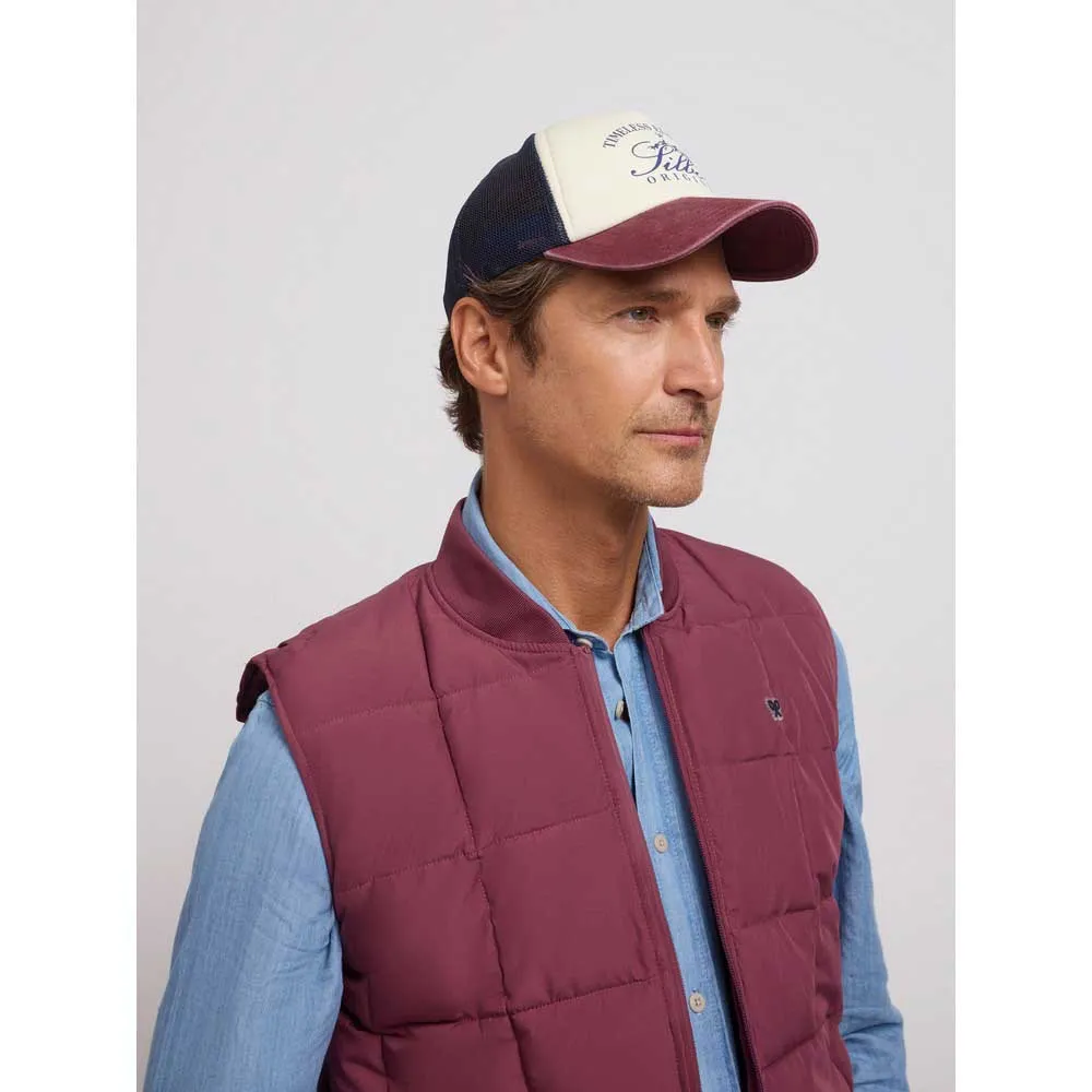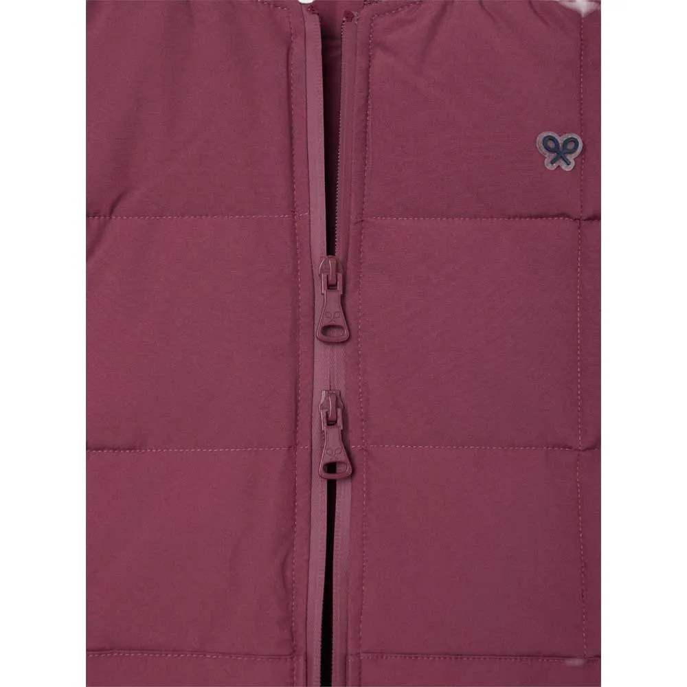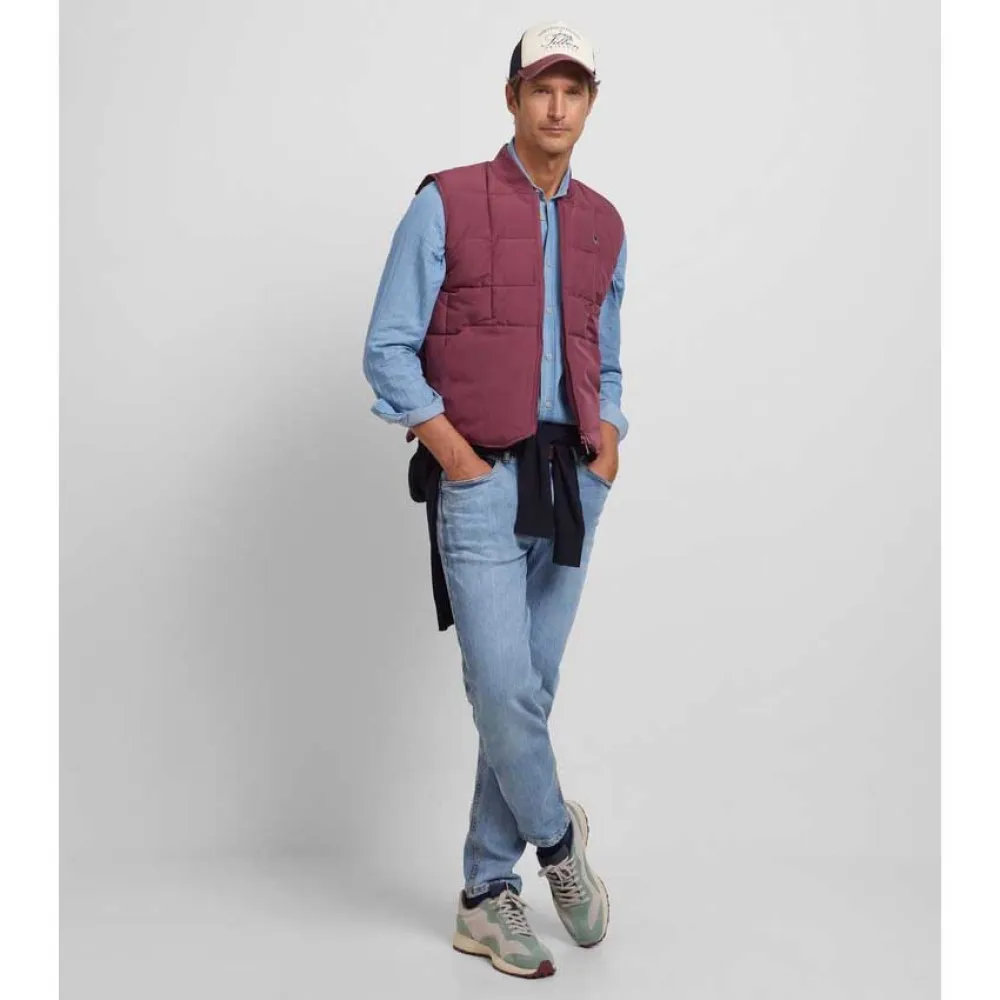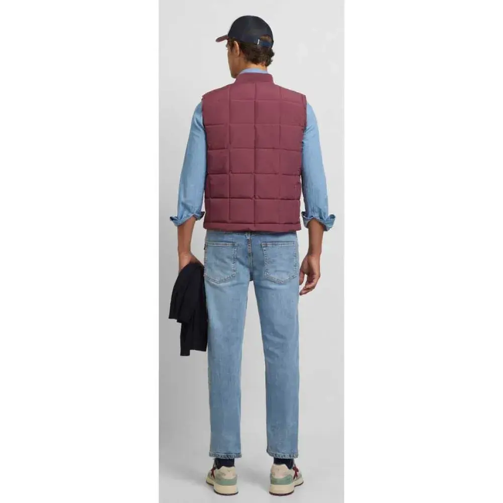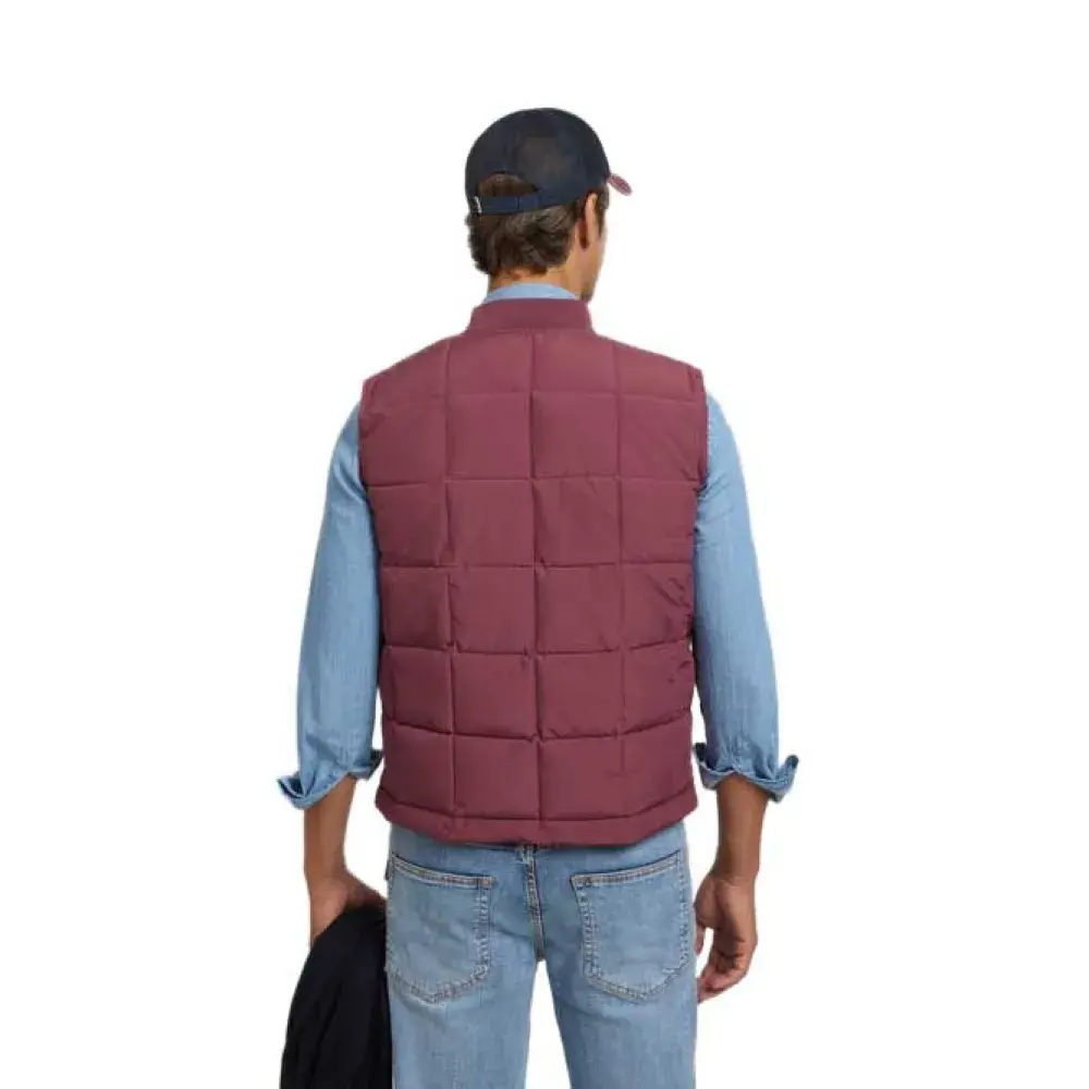 Технический жилет бордового цвета обычного покроя. Он оснащен двусторонней застежкой-молнией спереди, нестандартными язычками и высоким воротником. Он оснащен нашивкой для ракетки с микроинъекциями на торсе и внутренней подкладкой.