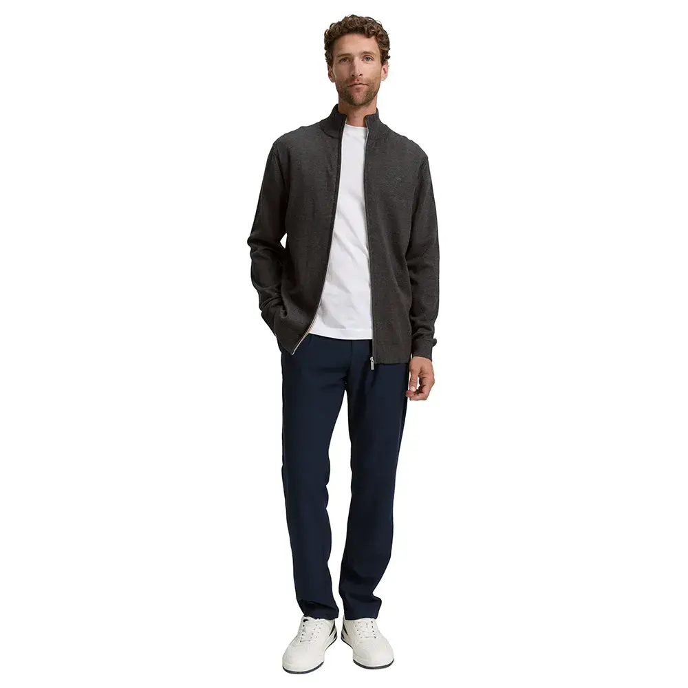 Базовый кардиган однотонной расцветки с небольшой вышивкой логотипа на груди и воротником-стойкой.