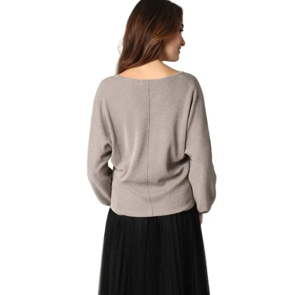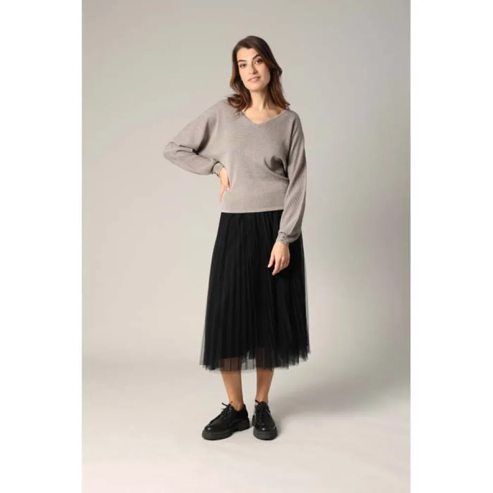 Женский свитер KIARA с элегантным блузочным кроем и шикарным женственным стилем. Эта модель из слегка переливающегося трикотажа придаст вашему наряду едва заметный блеск. Модель с приталенным V-образным вырезом, длинными рукавами-фонариками, затянутыми на манжетах и украшенными маленькими металлическими пуговицами для изысканной отделки. Спинка однотонная, а зауженный низ мягко подчеркивает силуэт. Незаменимый предмет гардероба, идеально подходящий для того, чтобы украсить образ на день или вечер.