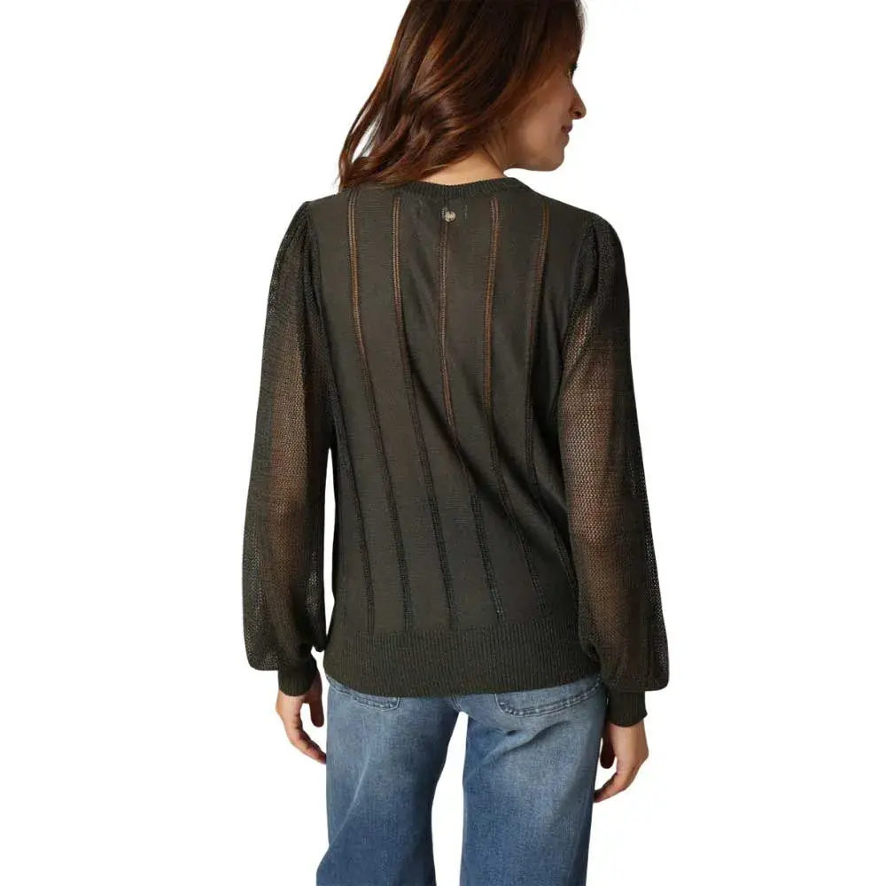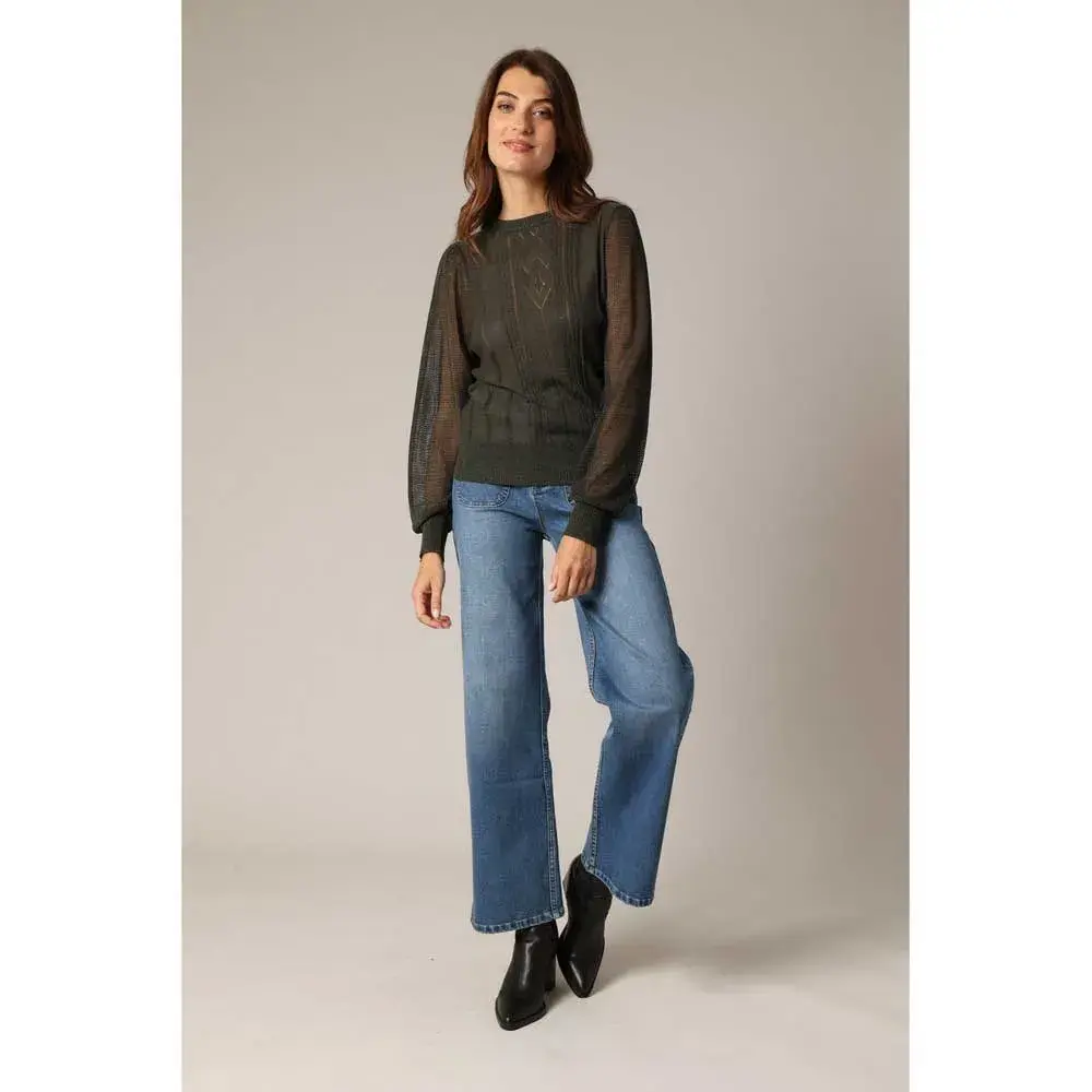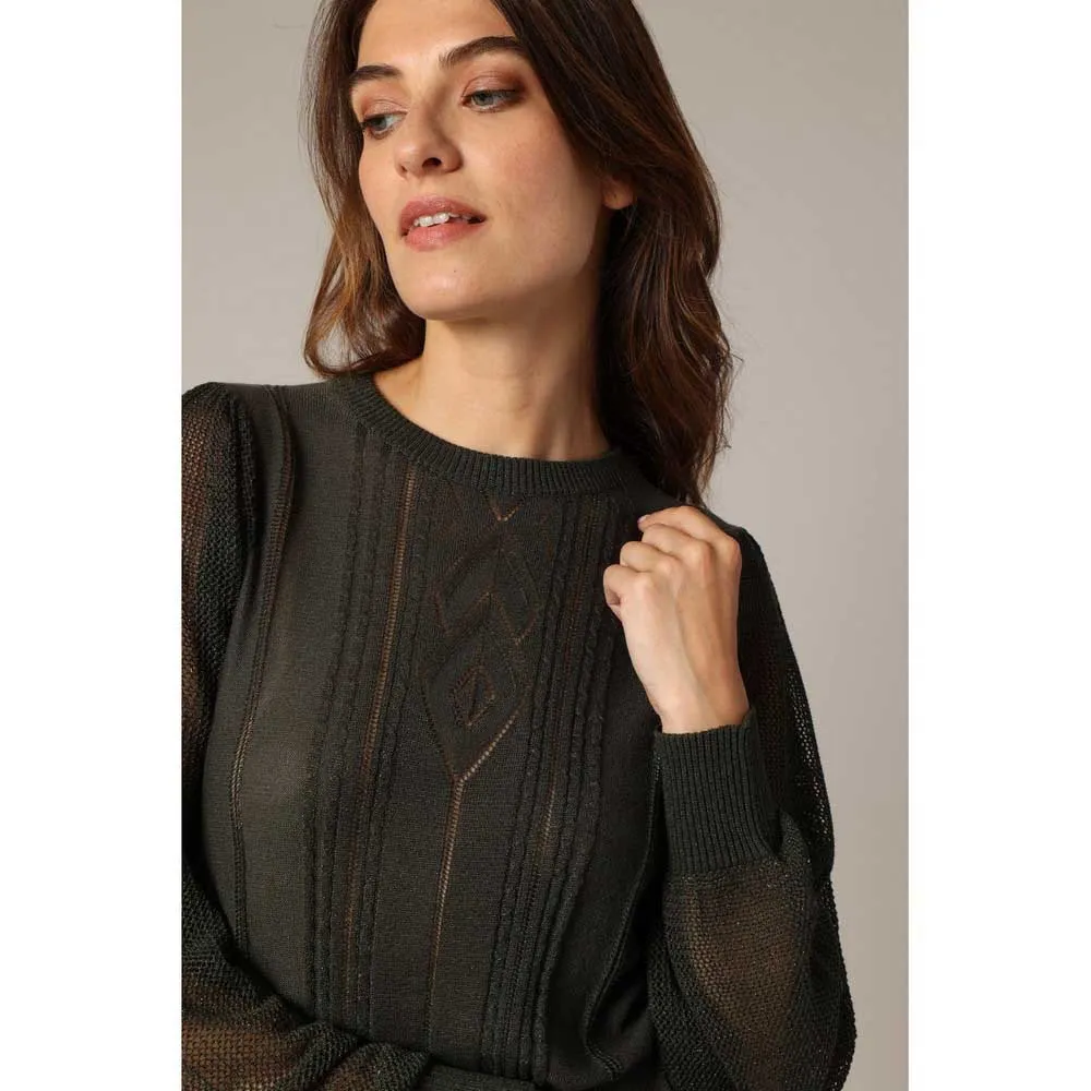 Женственный свитер NESSIA с длинными рукавами выделяется своим изысканным прозрачным эффектом, слегка ажурным по всей длине. Классический круглый вырез подчеркивает чувственность ажурного трикотажа, а слегка пышные проймы придают рукам объем, создавая элегантный и модный силуэт. Перед свитера украшен графическими узорами в тон, подчеркивающими его шикарный вид. Ребристые манжеты и пояс подчеркивают комфорт и посадку одежды. Идеальный фасон для нарядного образа, будь то днем или ночью, сочетайте с брюками с завышенной талией, юбкой или черными джинсами для изысканного контраста.