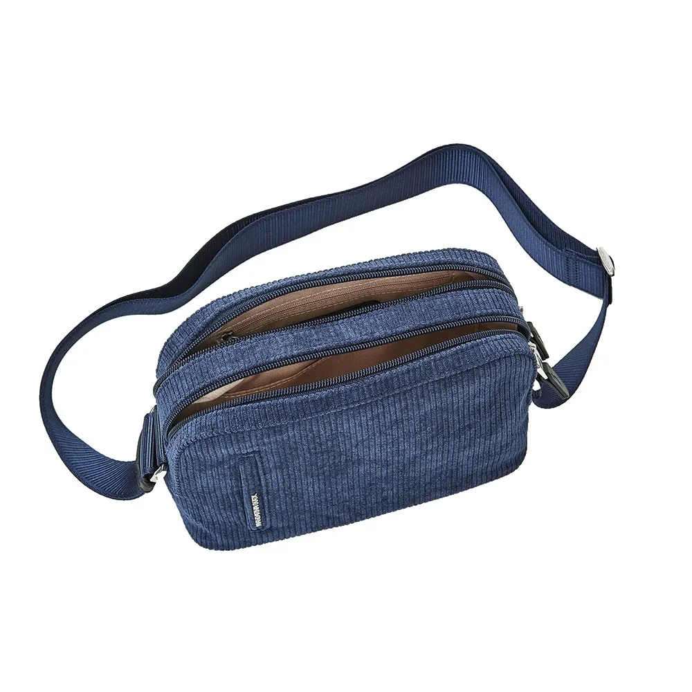Небольшая сумка через плечо с двойным отделением и тканевыми молниями.