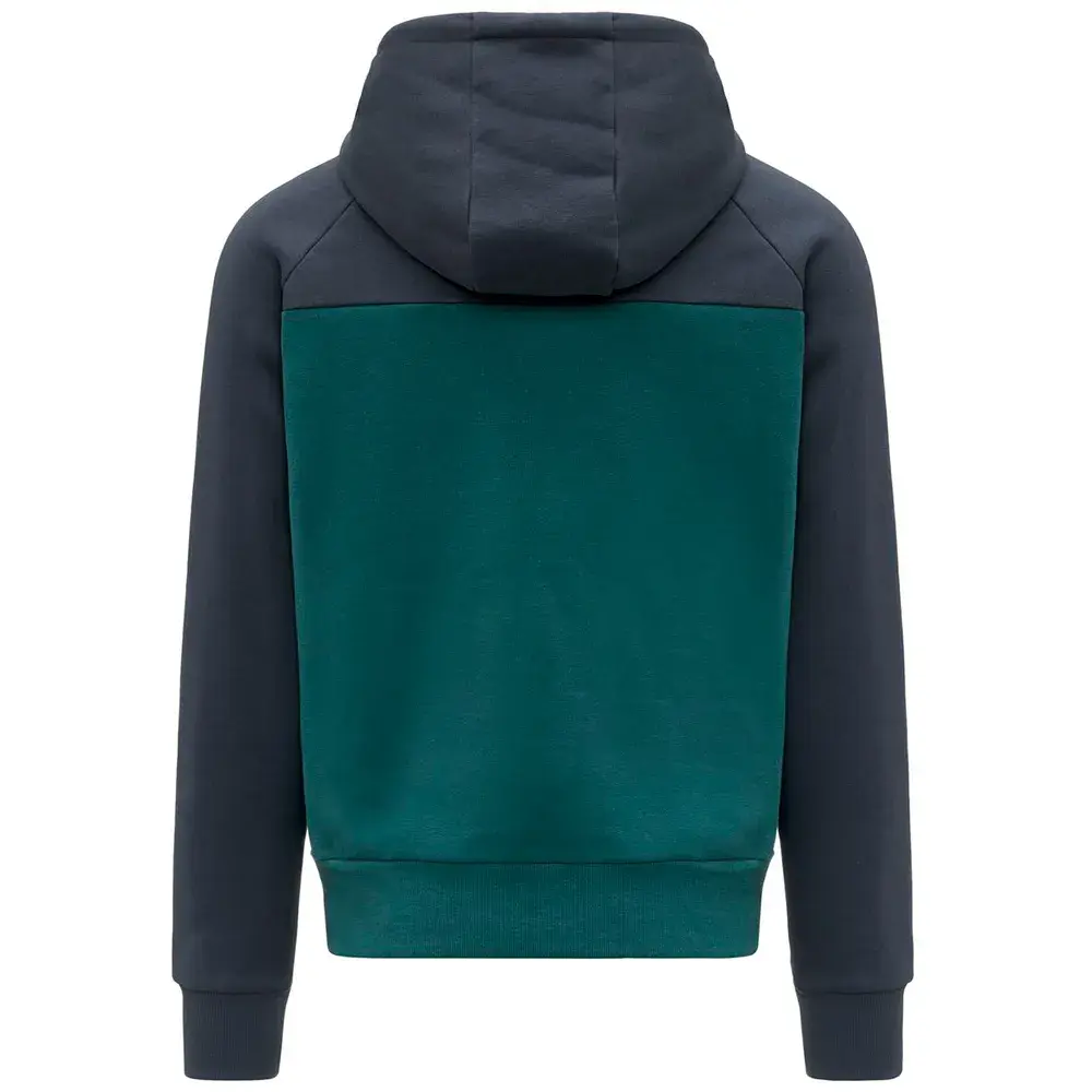 Манжеты и низ в рубчик, контрастный капюшон с завязками, V-образная деталь на вырезе спереди, контрастные вставки на рукавах и спинке из вторичной ткани, контрастный плоский рант, проймы реглан.