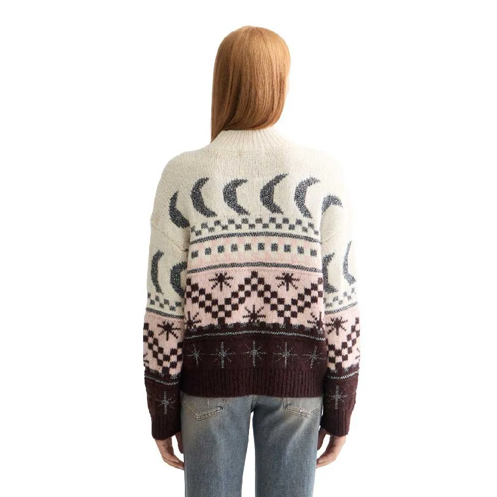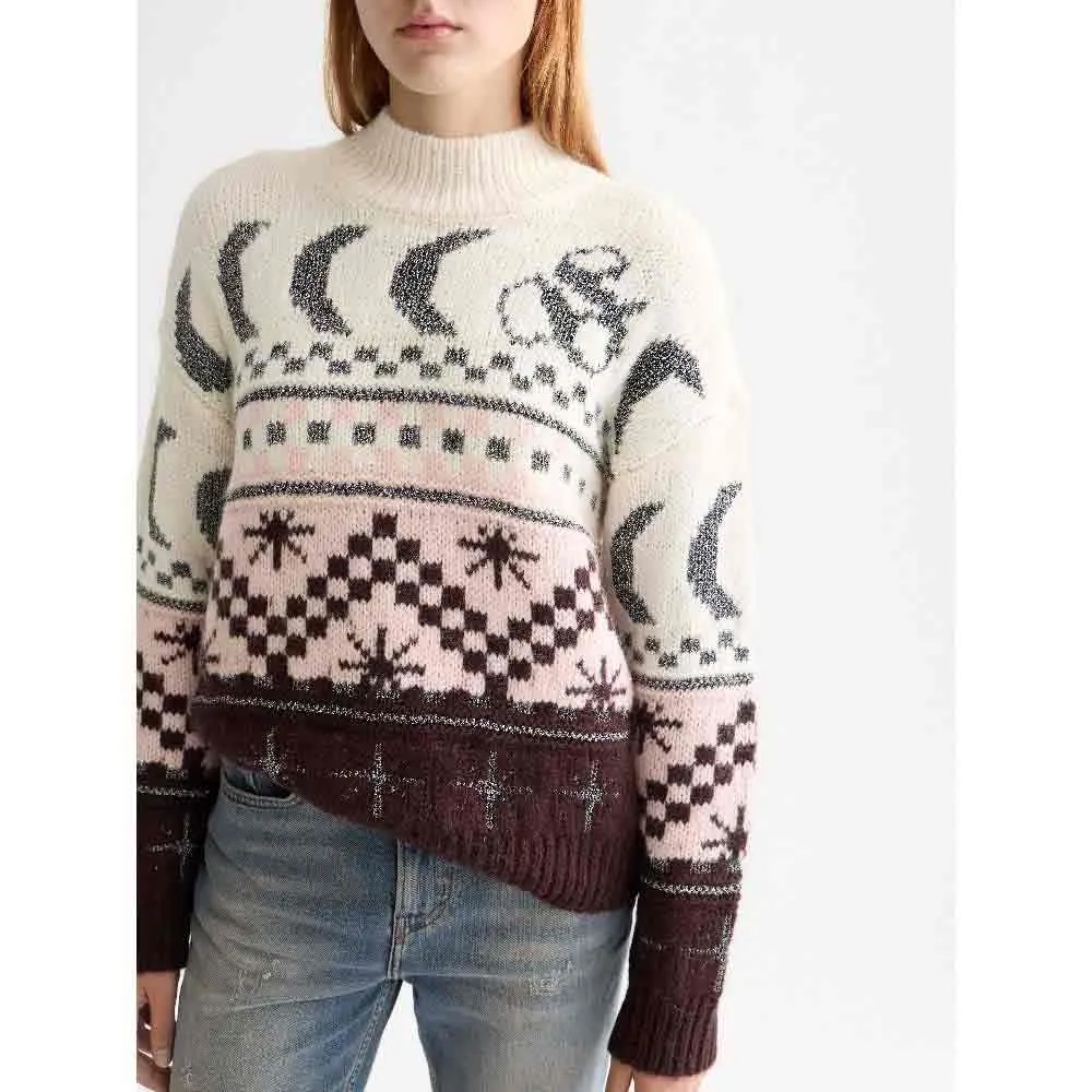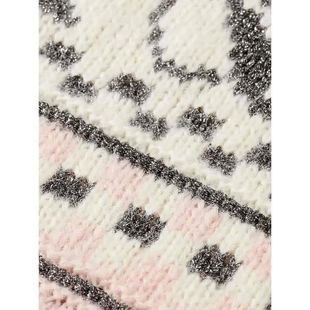 Главной особенностью этого потрясающего пуловера является искусное переосмысление классического узора Fair Isle. Любимый дизайн, известный своими замысловатыми геометрическими мотивами и богатой уютной историей, дополнен изящно сплетенными металлическими нитями. Эта уникальная изюминка превращает уютное основное блюдо в настоящее украшение, гарантируя, что вы будете выделяться сдержанной элегантностью, наслаждаетесь ли вы бодрящей осенней прогулкой, встречаетесь с друзьями за поздним завтраком или посещаете праздничное мероприятие. Тонкий блеск придает традиционному трикотажу нотку волшебства, создавая одновременно ностальгический и освежающе современный образ.