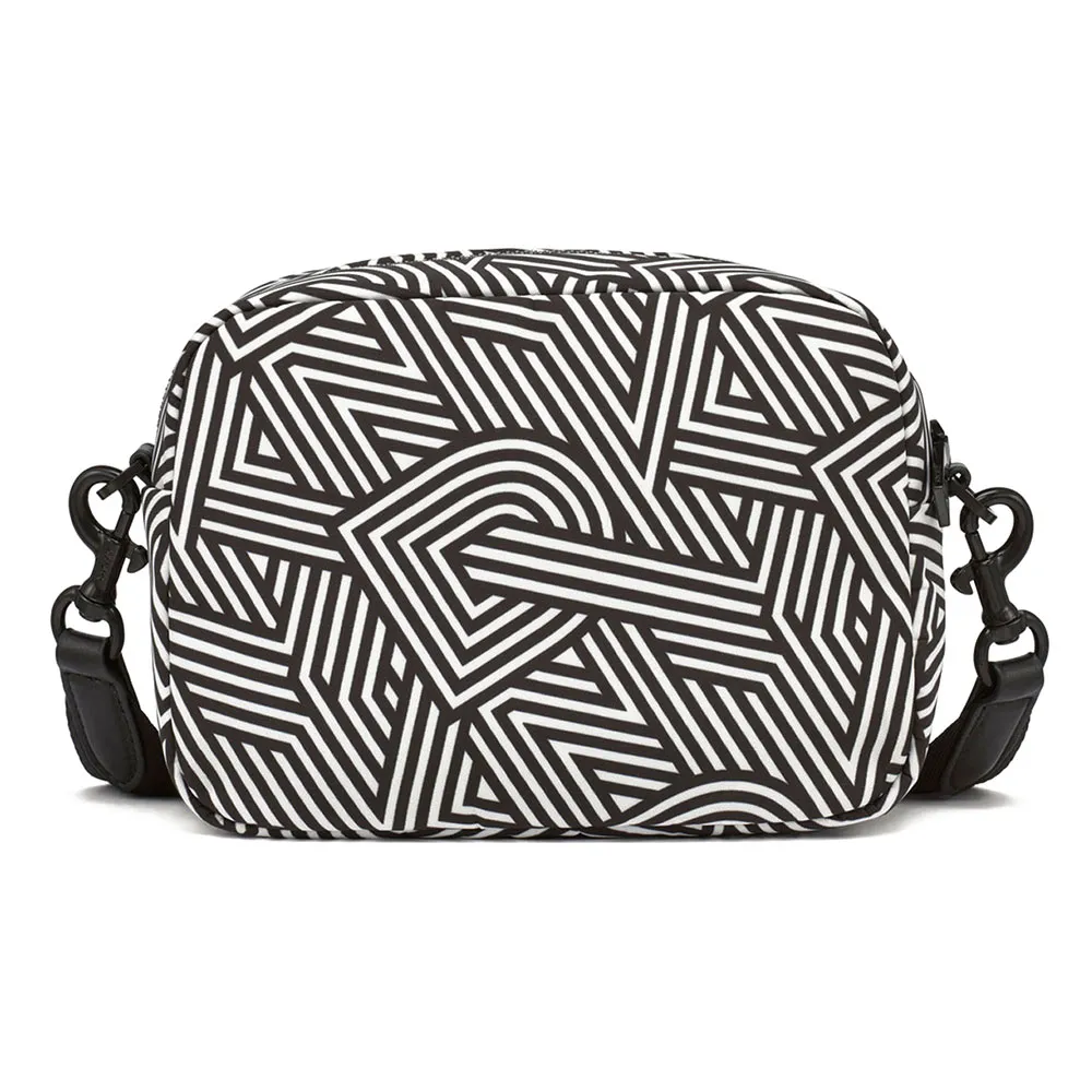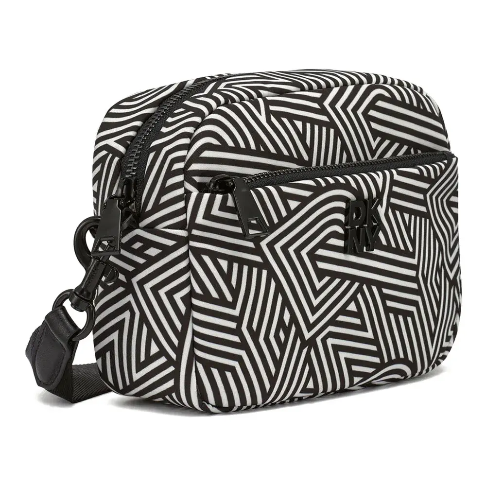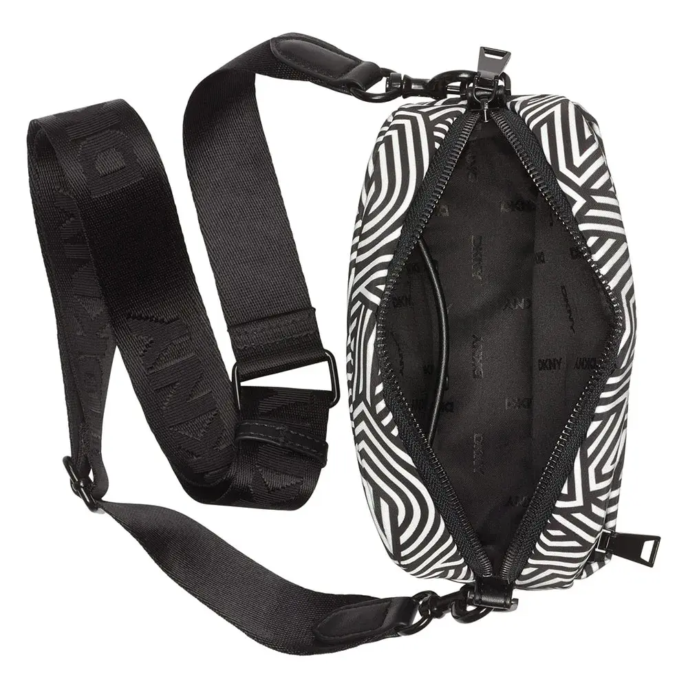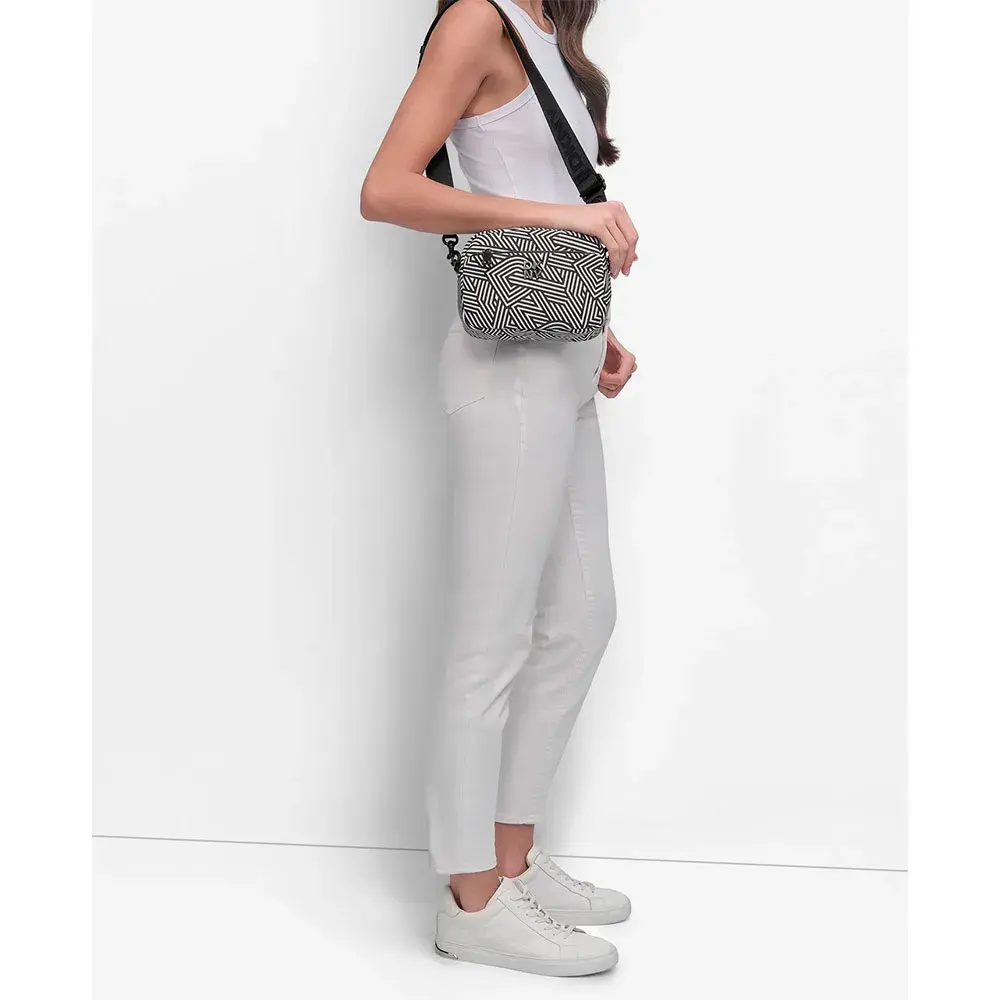Сумка для фотоаппарата DKNY с регулируемым ремнем через плечо и логотипом спереди.