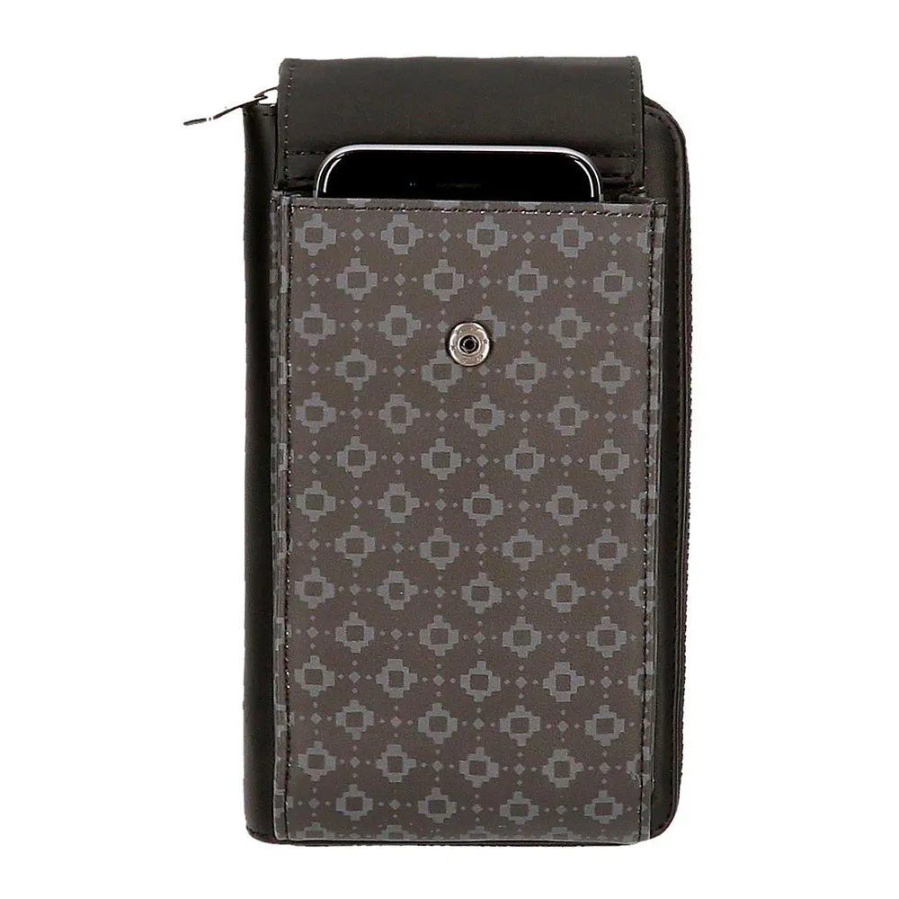 Сумка через плечо с держателем для мобильного телефона размером 11 х 20 х 4 см изготовлена из полиэстера и деталей из синтетической кожи.