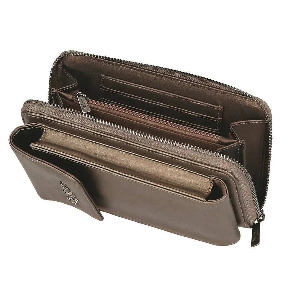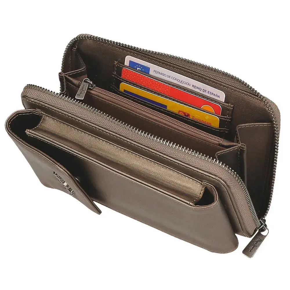 Основное отделение с двумя отделениями, портмоне на молнии и тремя слотами для карт.