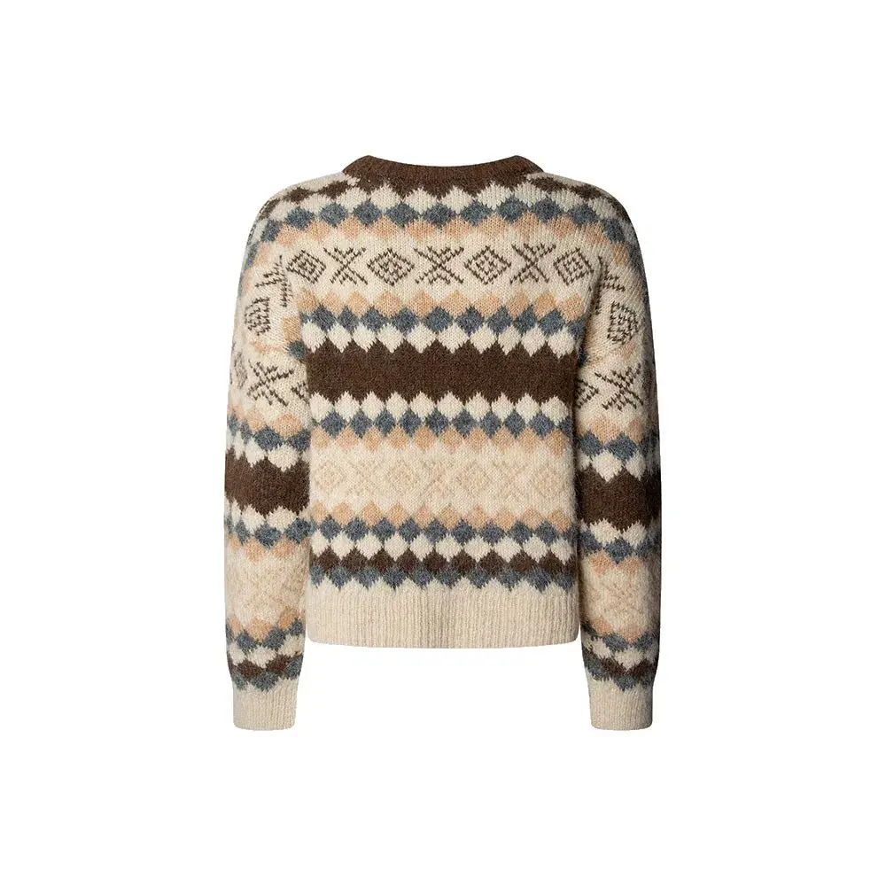 Трикотаж с округлым вырезом горловины, длинными рукавами, ребристыми манжетами, подолом и воротником и жаккардовыми деталями по всему периметру.