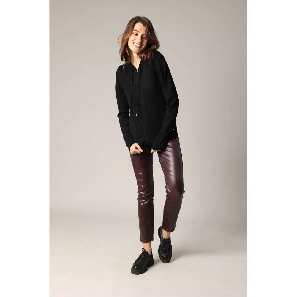 Этот женский жилет на молнии, изготовленный из легкого трикотажа, обогащенного металлическими волокнами, сочетает в себе комфорт и тонкий блеск. Приталенный крой и отделка в рубчик придают ему современный вид, а капюшон с завязками - повседневный. В этом стиле достигается идеальный баланс между повседневностью и изысканностью.