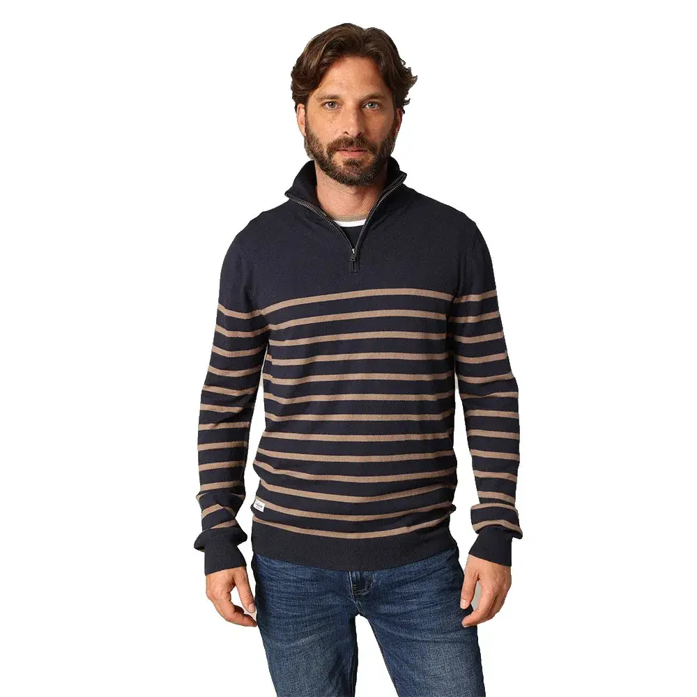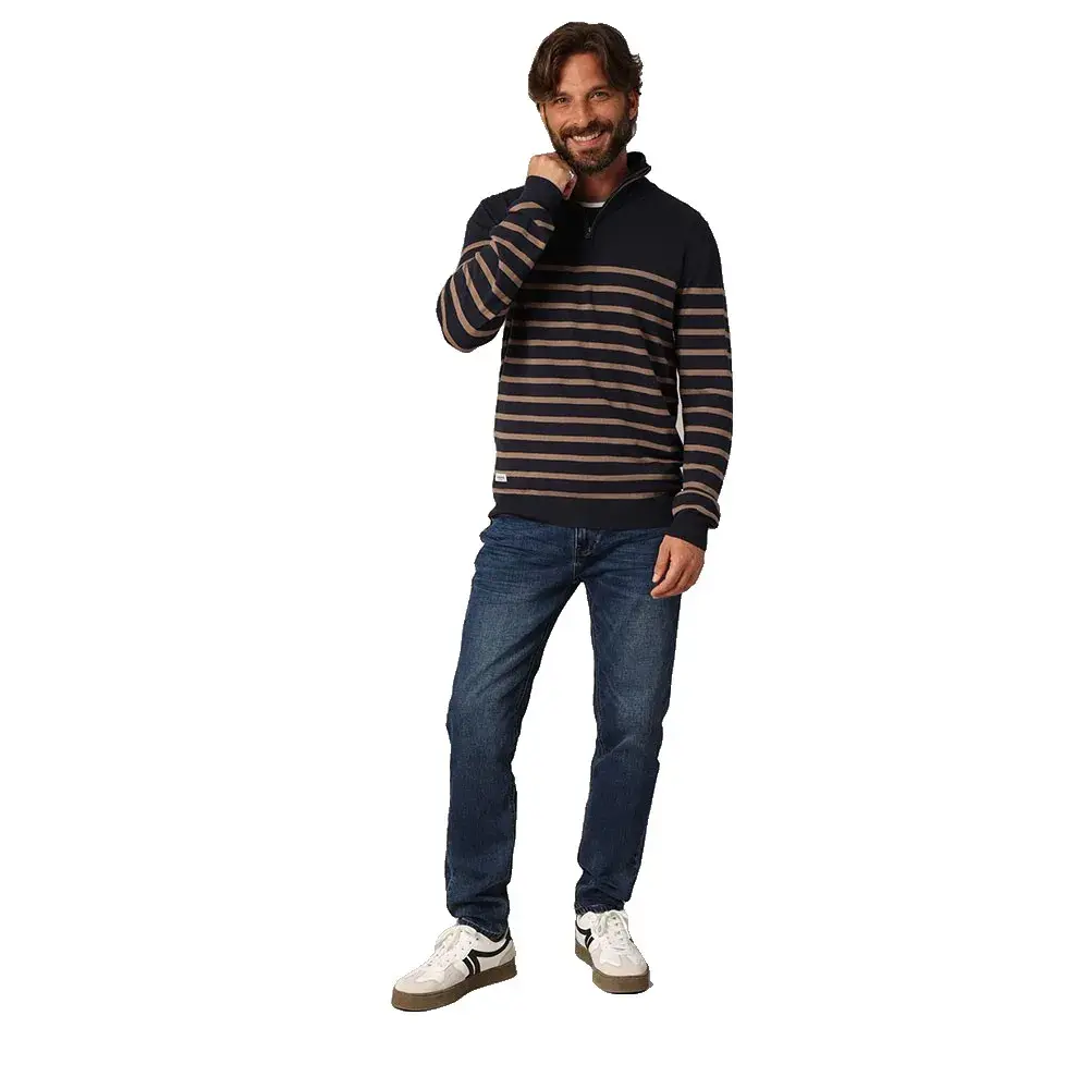 Этот повседневный свитер с высоким воротом на молнии очаровывает своим обновленным морским стилем. У него удобный прямой крой, длинные рукава и воротник на молнии, который позволяет регулировать вырез по вашему желанию.Узор в горизонтальную полоску по всему телу и рукавам придает изделию графичности и динамичности. Манжеты и пояс в рубчик гарантируют хорошую посадку. Маленькая вышитая нашивка "Deeluxe original" незаметно пришита спереди, в нижней части изделия.