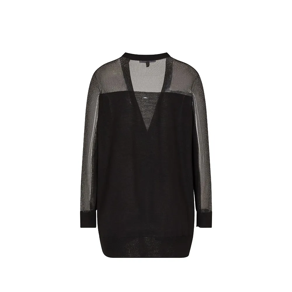 Кардиган удлиненного кроя, с v-образным вырезом и застежкой на одну металлическую пуговицу, верхняя часть и рукава с прозрачной вставкой.