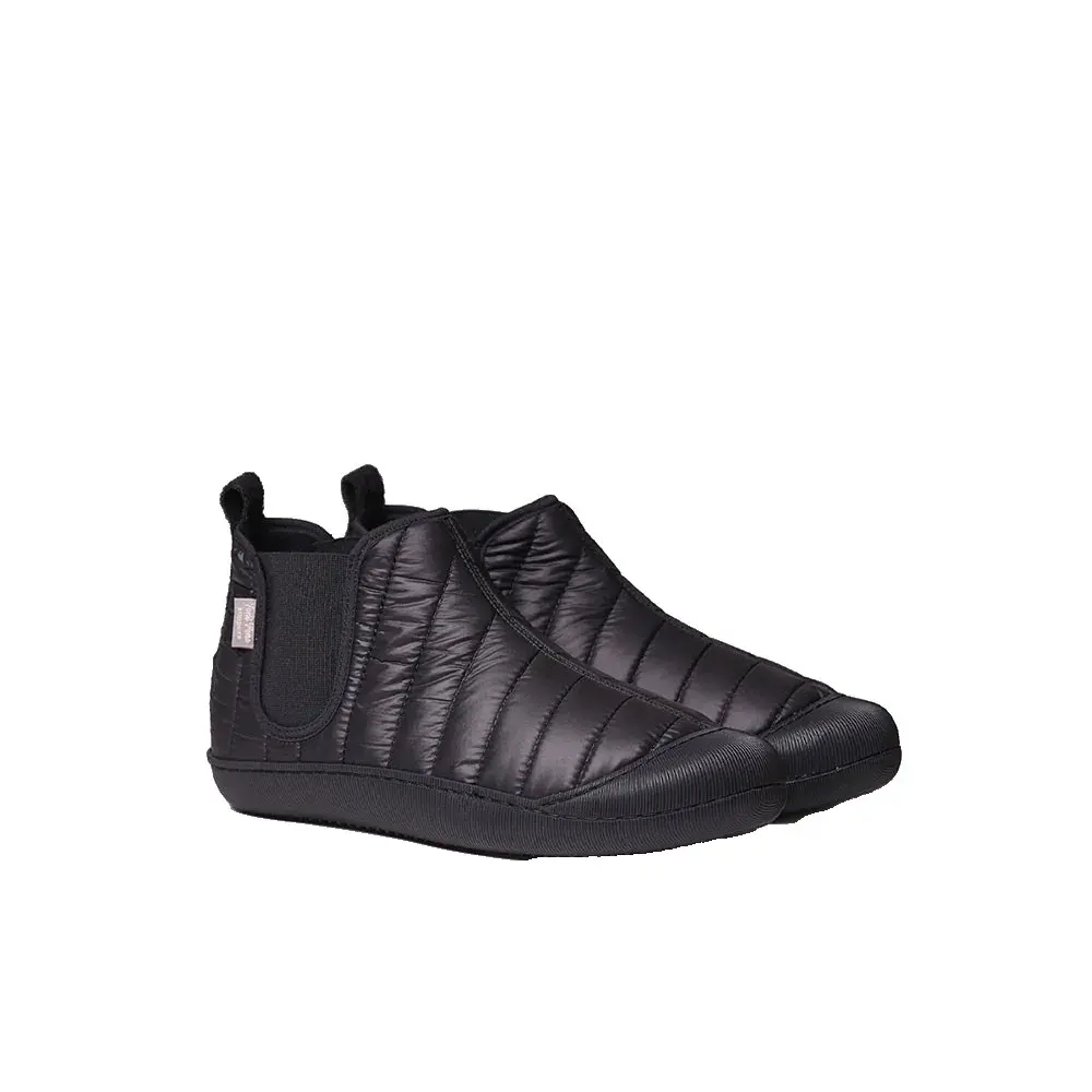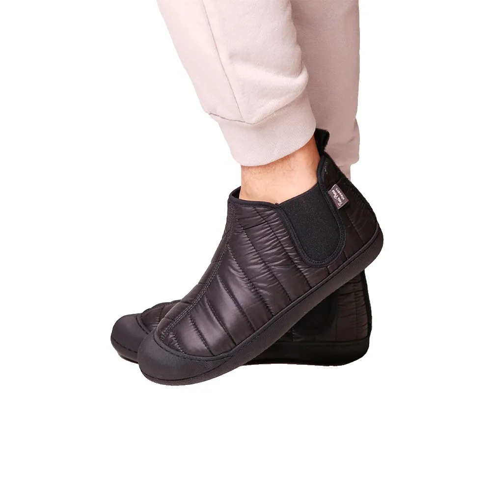 Эти мужские тапочки в стиле ботильонов на щиколотке изготовлены из резины и стеганой ткани.