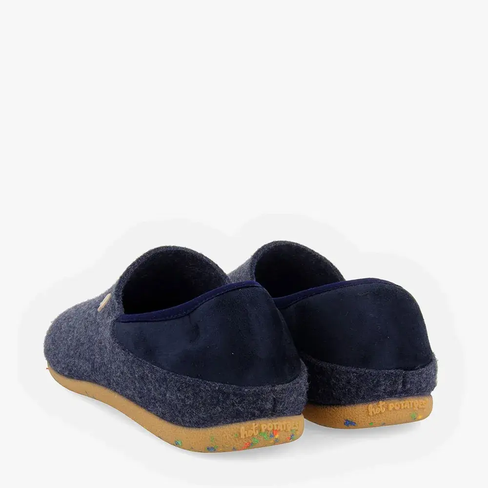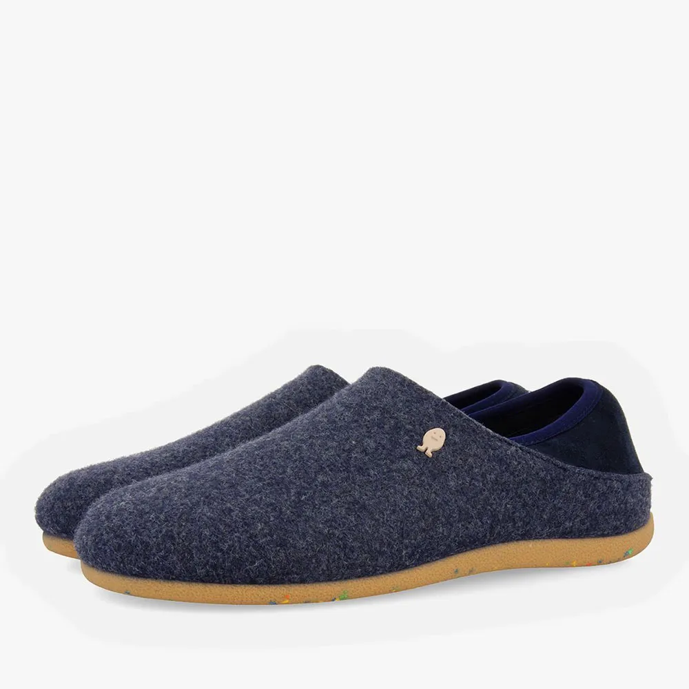 Домашние туфли в стиле темно-синих тапочек, верх из переработанного ПЭТ-войлока, каблук из мягкой полиэстеровой ткани для лучшей поддержки, отделка из мягкой полиэстеровой ткани и стелька из переработанного ПЭТ-войлока.