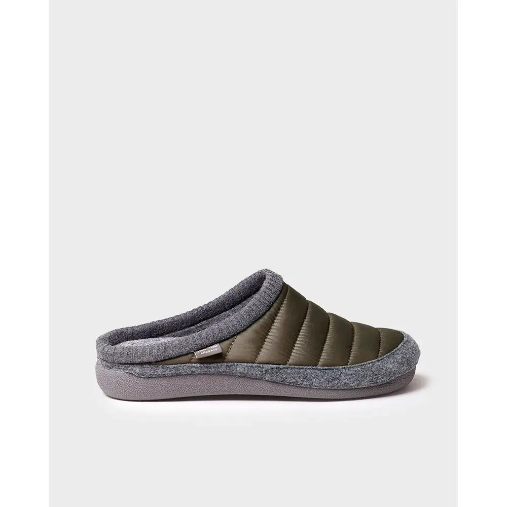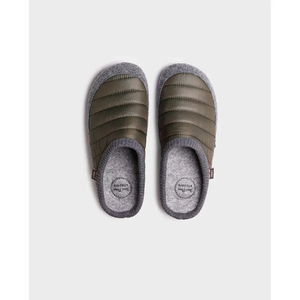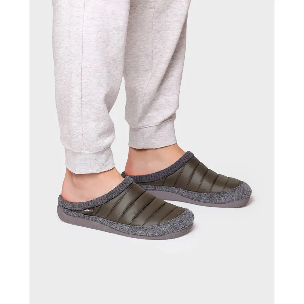 В этих мужских тапочках-сабо сочетаются стеганая ткань и войлок.