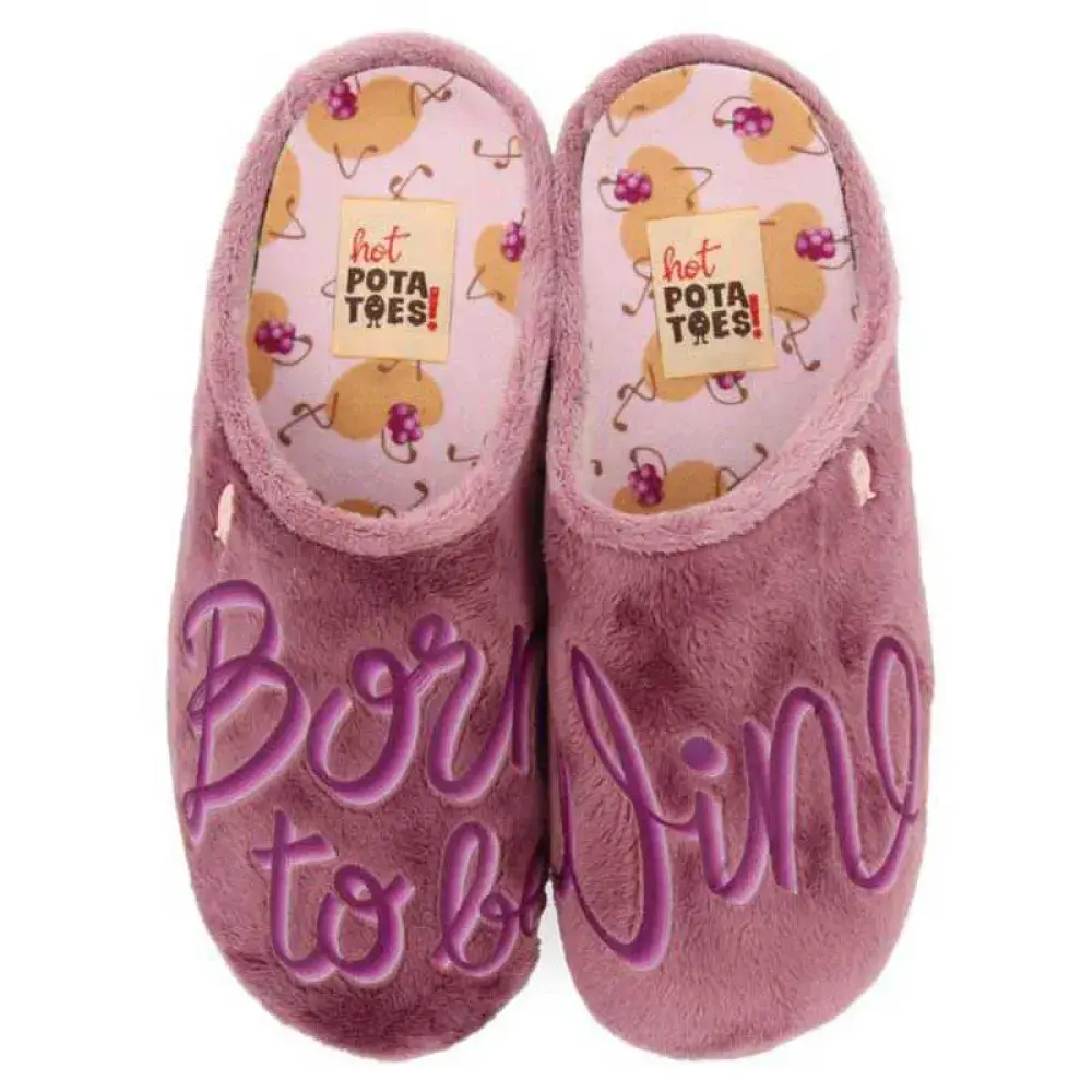 Женские тапочки из лилового меха с надписью и растениями, напечатанными на переработанном материале.