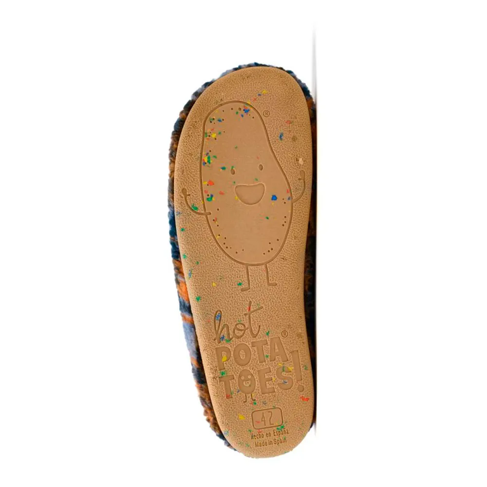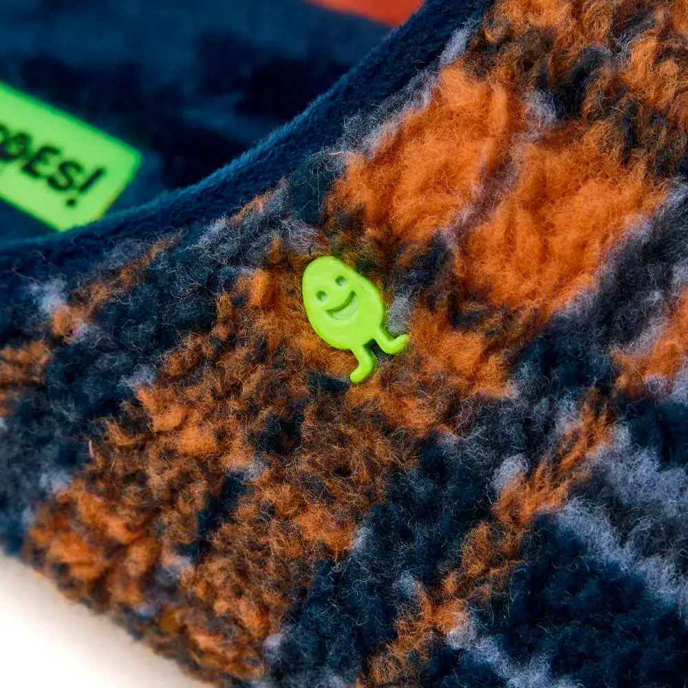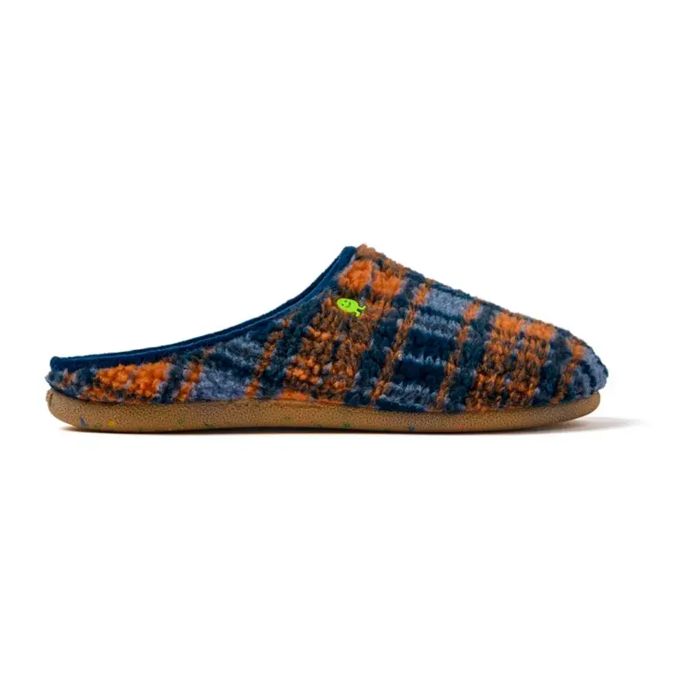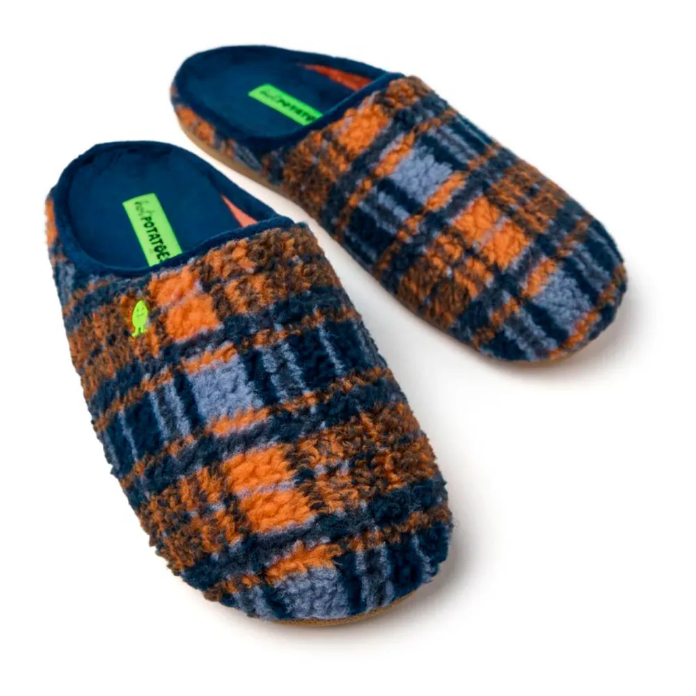 Комфорт для дома с тапочками из искусственного меха с эффектом шерпа в клетку, мягкой съемной стелькой из искусственного меха, дышащей подкладкой и верхом из полиэстера, стелькой из 100% переработанного полиуретана и гибкой подошвой из 75% натурального каучука с добавлением стружки EVA.
