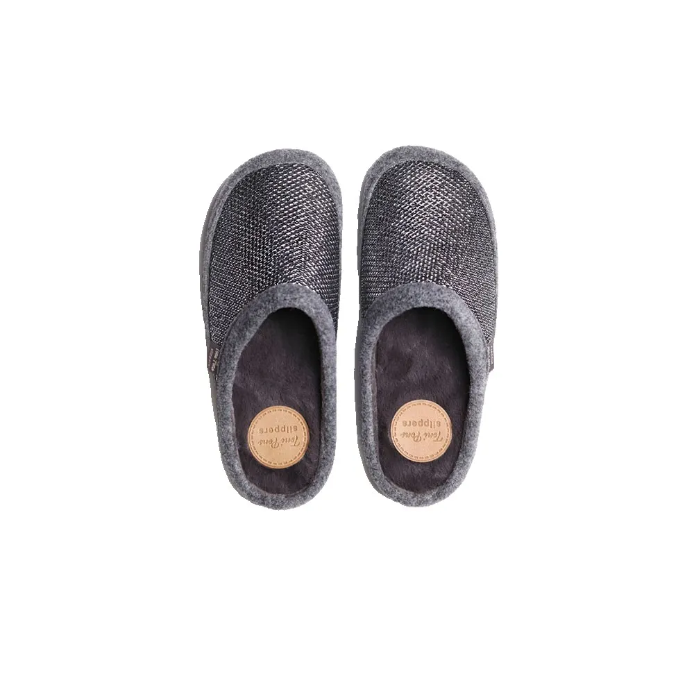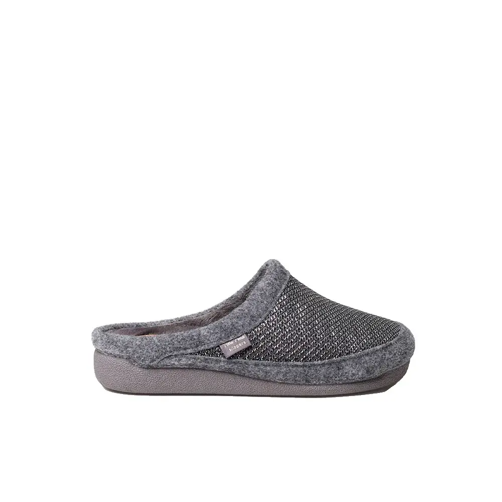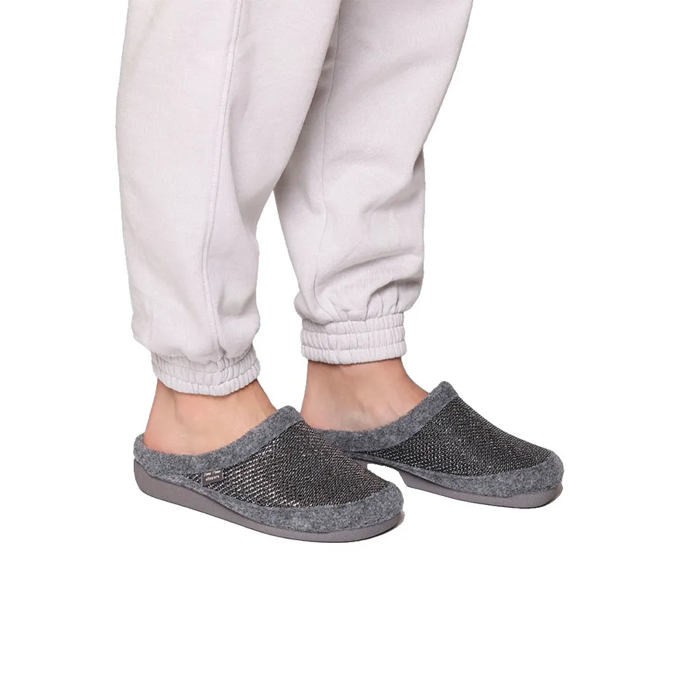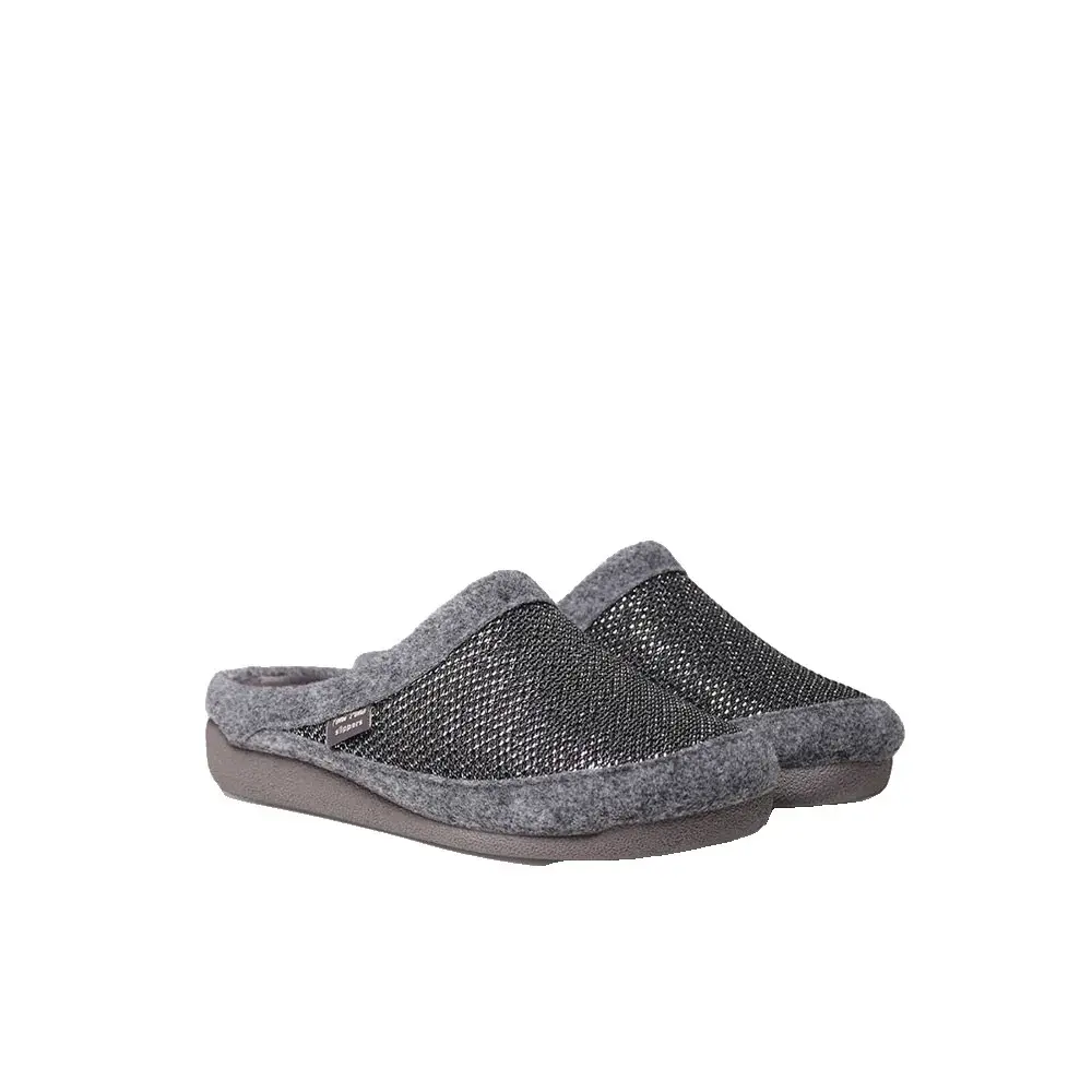 Эти женские домашние тапочки типа сабо сочетают в себе ткань с блестящей отделкой и войлок в тон, подкладку и внутреннюю стельку из мягкого синтетического меха.