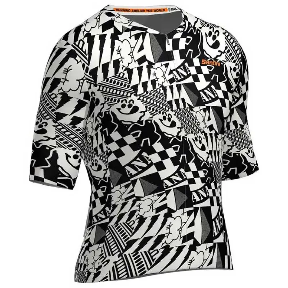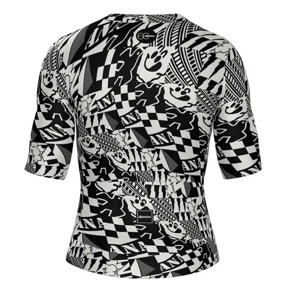 По всей майке принт с рисунком вдохновлен восемью легендарными командами, с которыми Сантини общие незабываемые моменты в истории велоспорта: