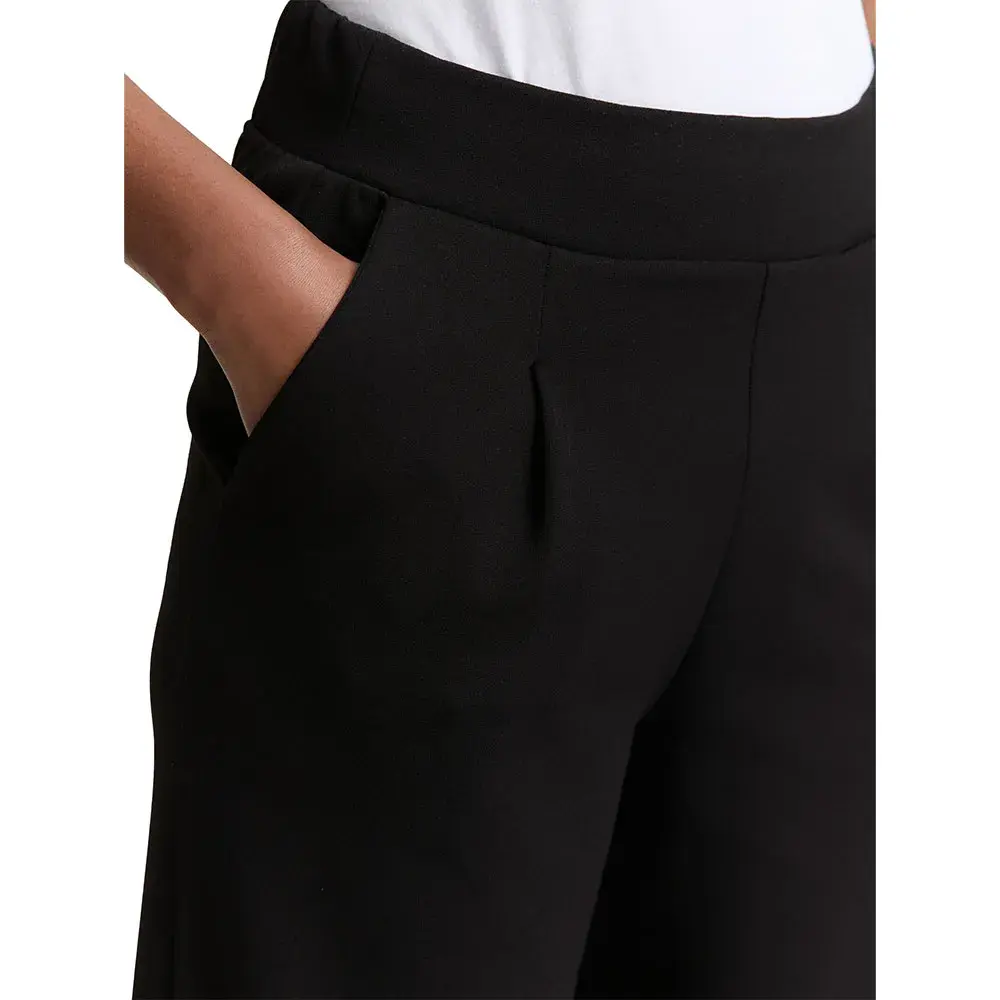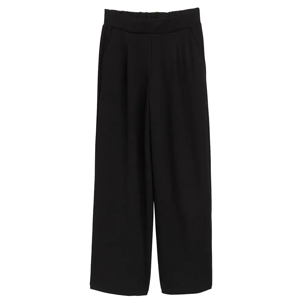 Брюки из ткани с эластичным поясом, боковыми карманами и плиссированными деталями спереди.